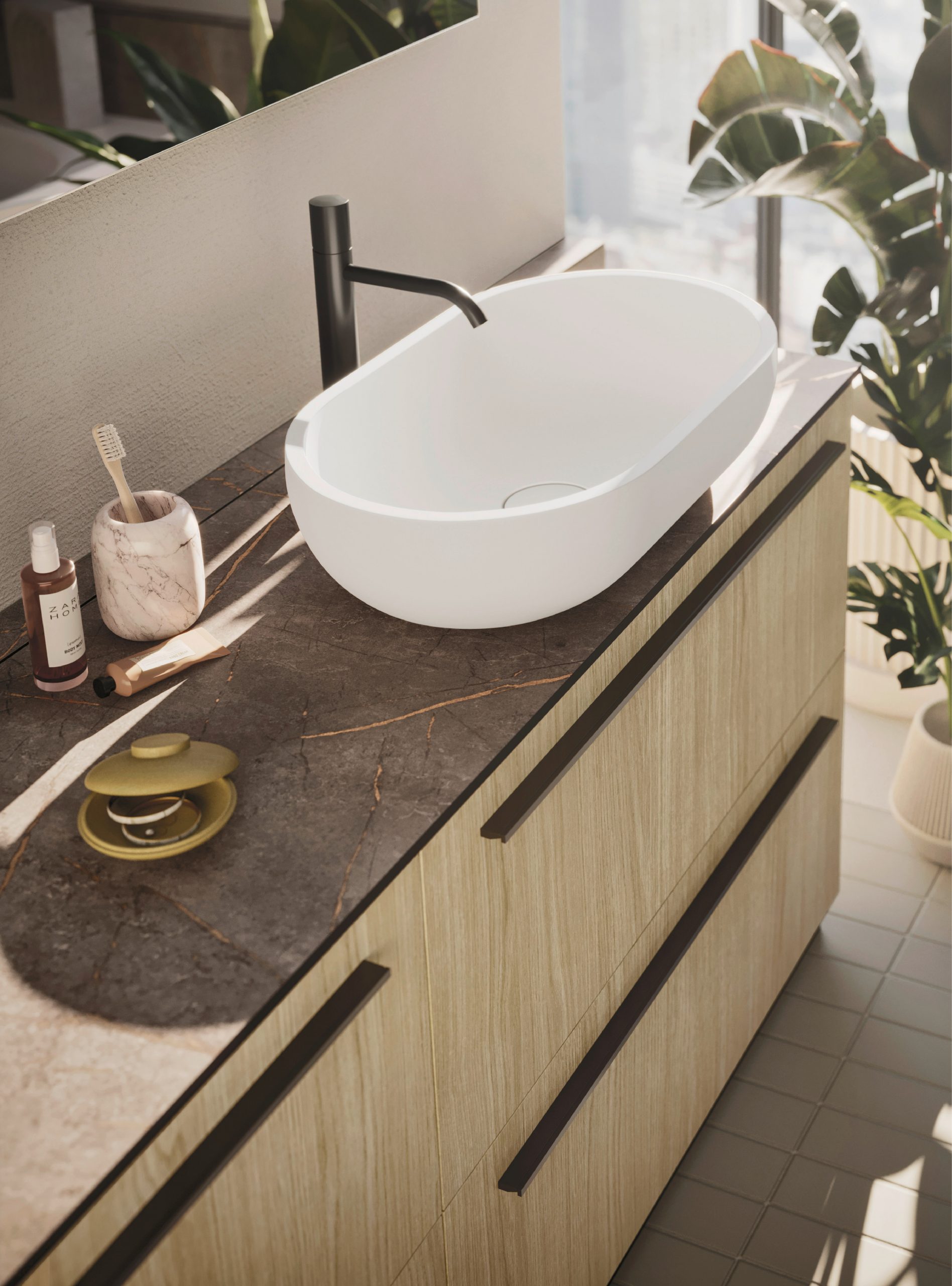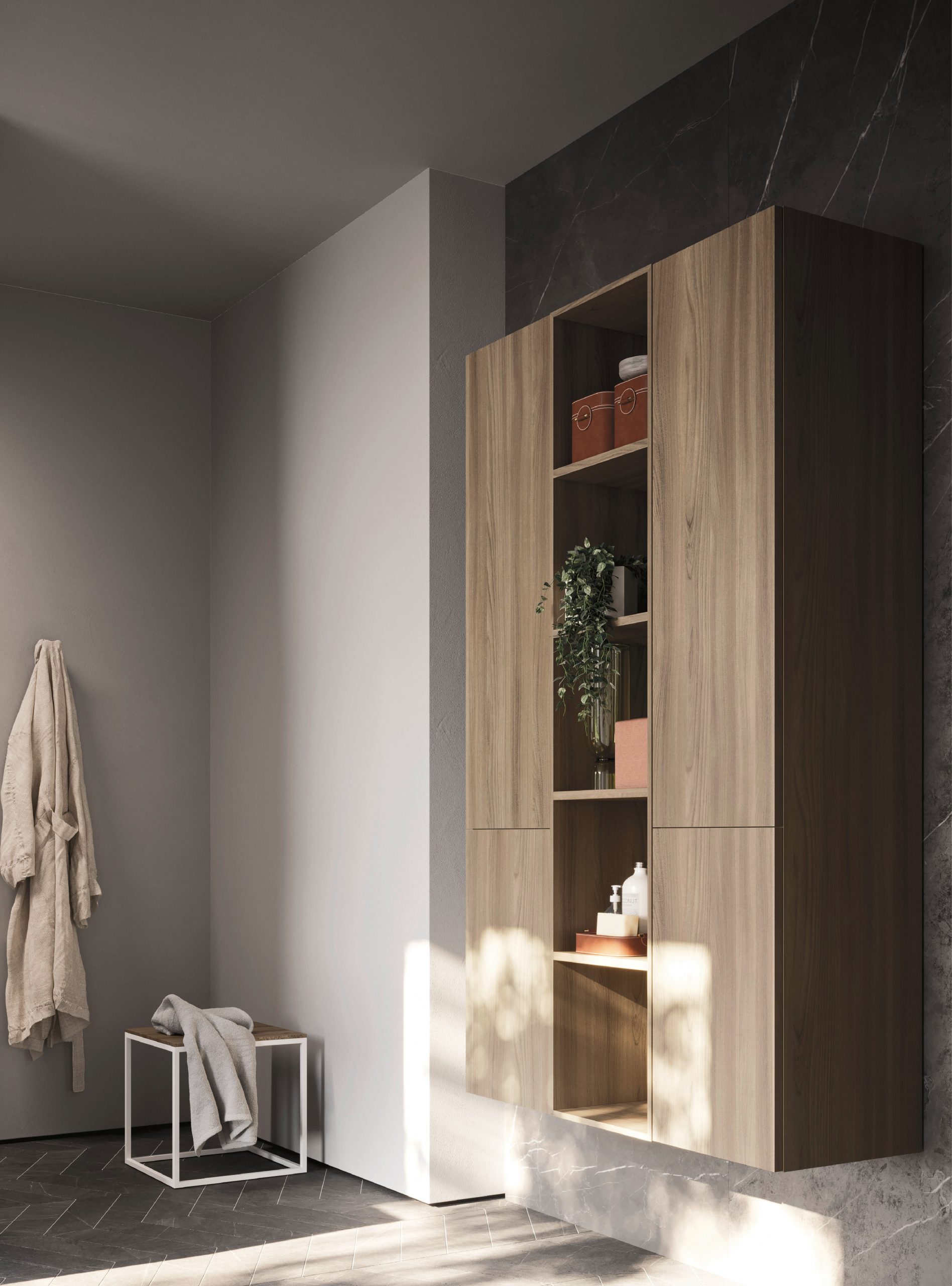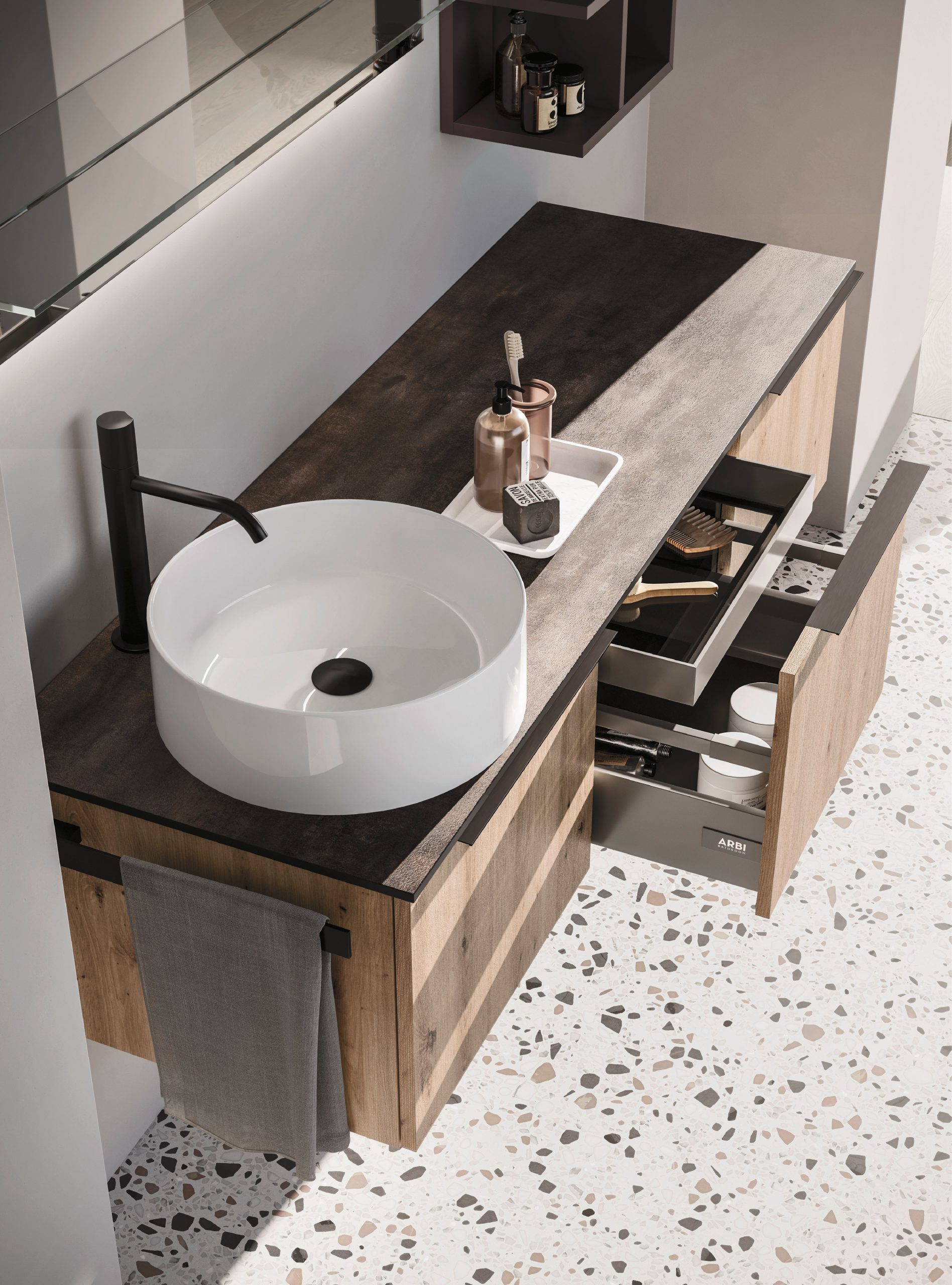 Ho.Me Plus is an innovative collection by Arbi Arredobagno that brings together a wide range of finishes in thermo-structured melamine with natural veins, classic or trendy colors. The collection is available in two variants: one with flat front and handle, the other with the integrated “J” handle grip. Flexible in the modularity thanks to the choice between three depths and different widths, the collection is enriched by the curved version, which offers base units with soft lines to satisfy even the optimization needs of the smallest spaces.