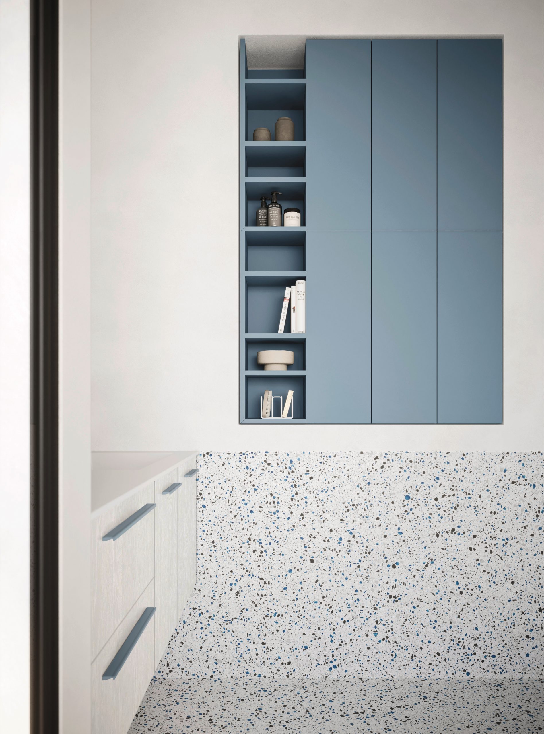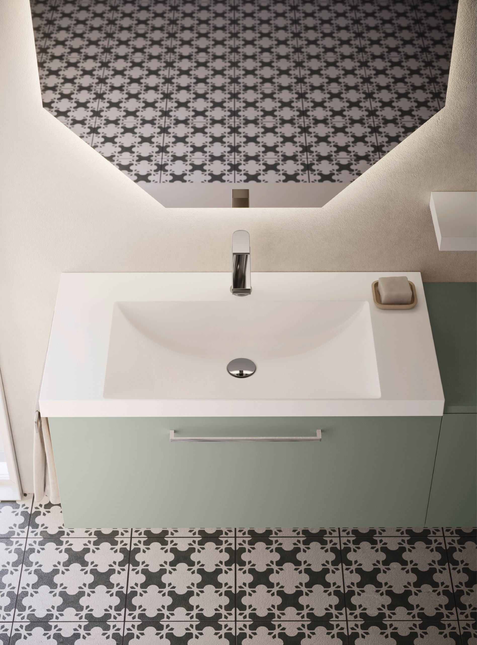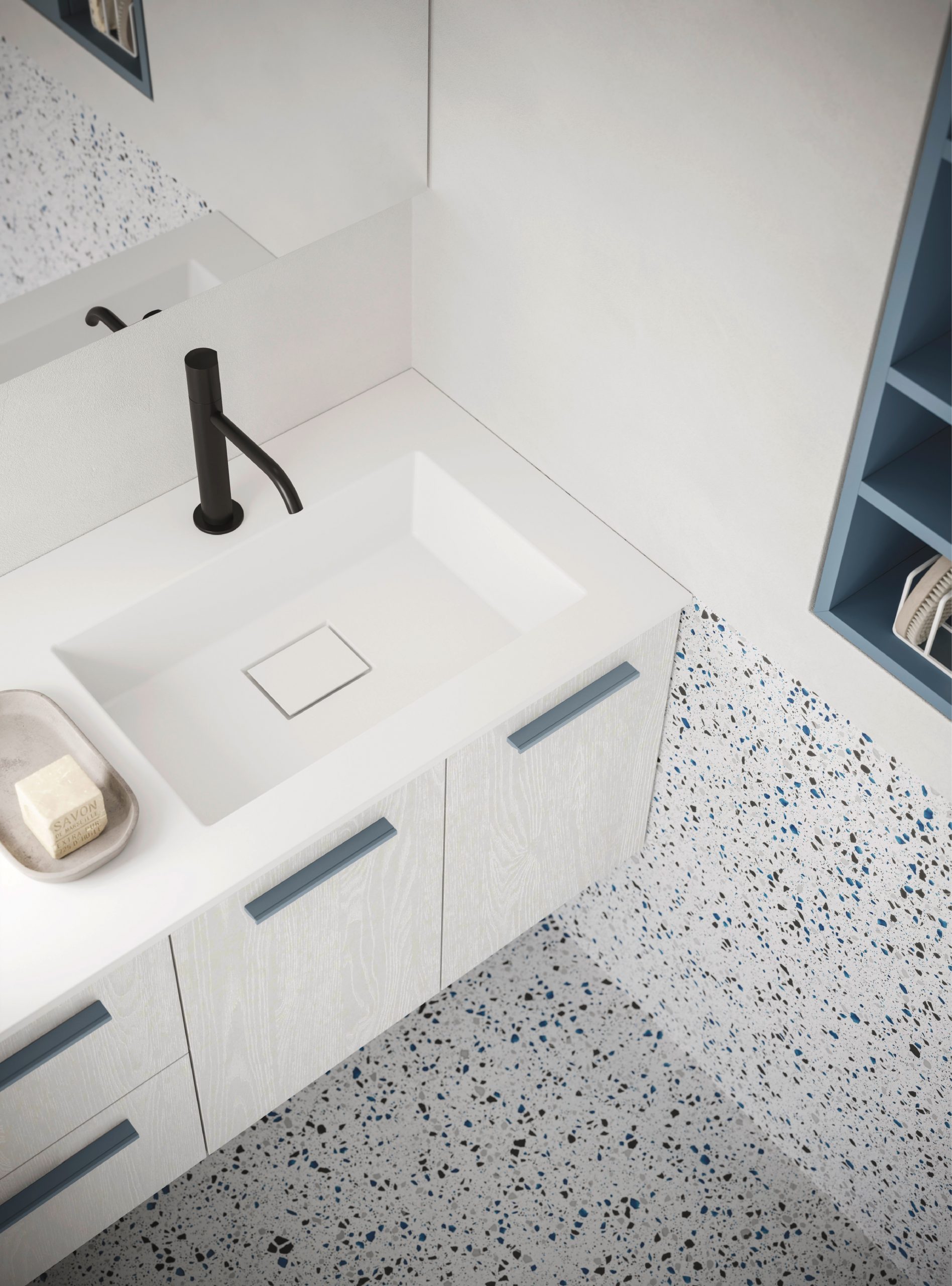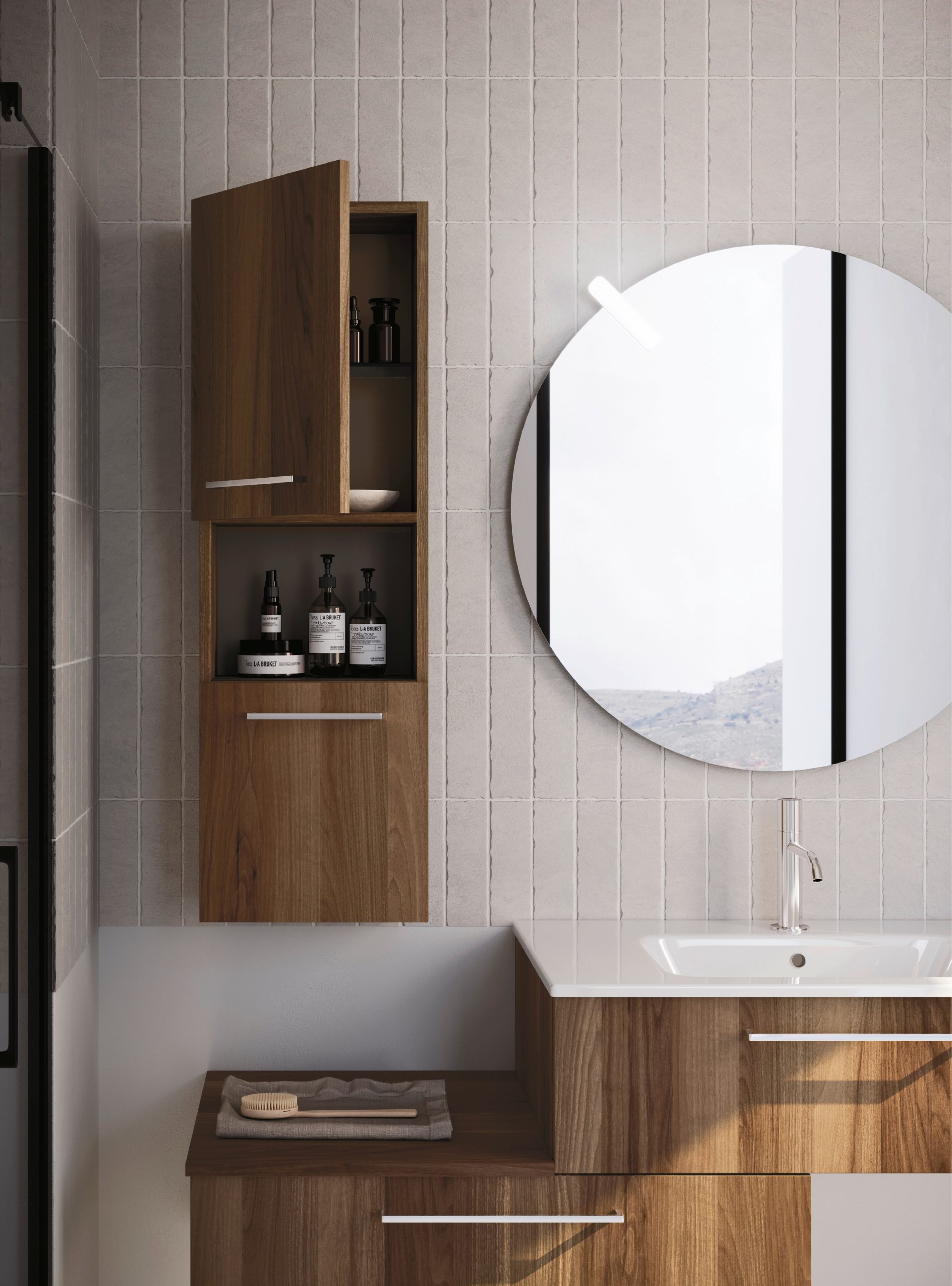 Ho.Me Plus is an innovative collection by Arbi Arredobagno that brings together a wide range of finishes in thermo-structured melamine with natural veins, classic or trendy colors. The collection is available in two variants: one with flat front and handle, the other with the integrated “J” handle grip. Flexible in the modularity thanks to the choice between three depths and different widths, the collection is enriched by the curved version, which offers base units with soft lines to satisfy even the optimization needs of the smallest spaces.