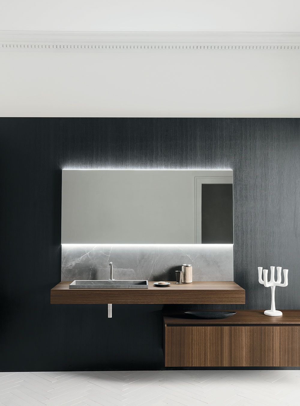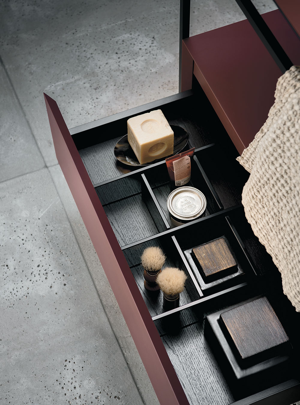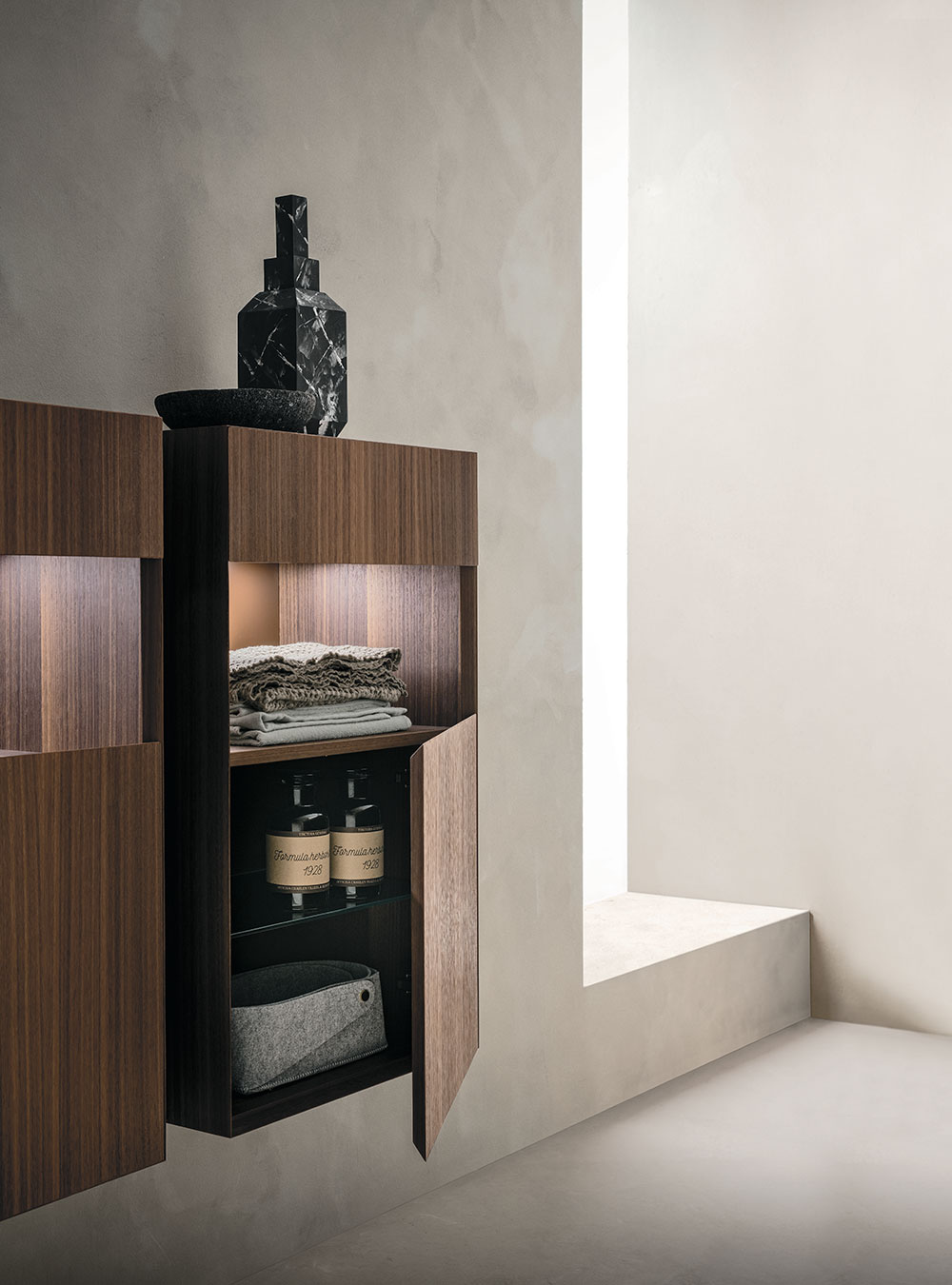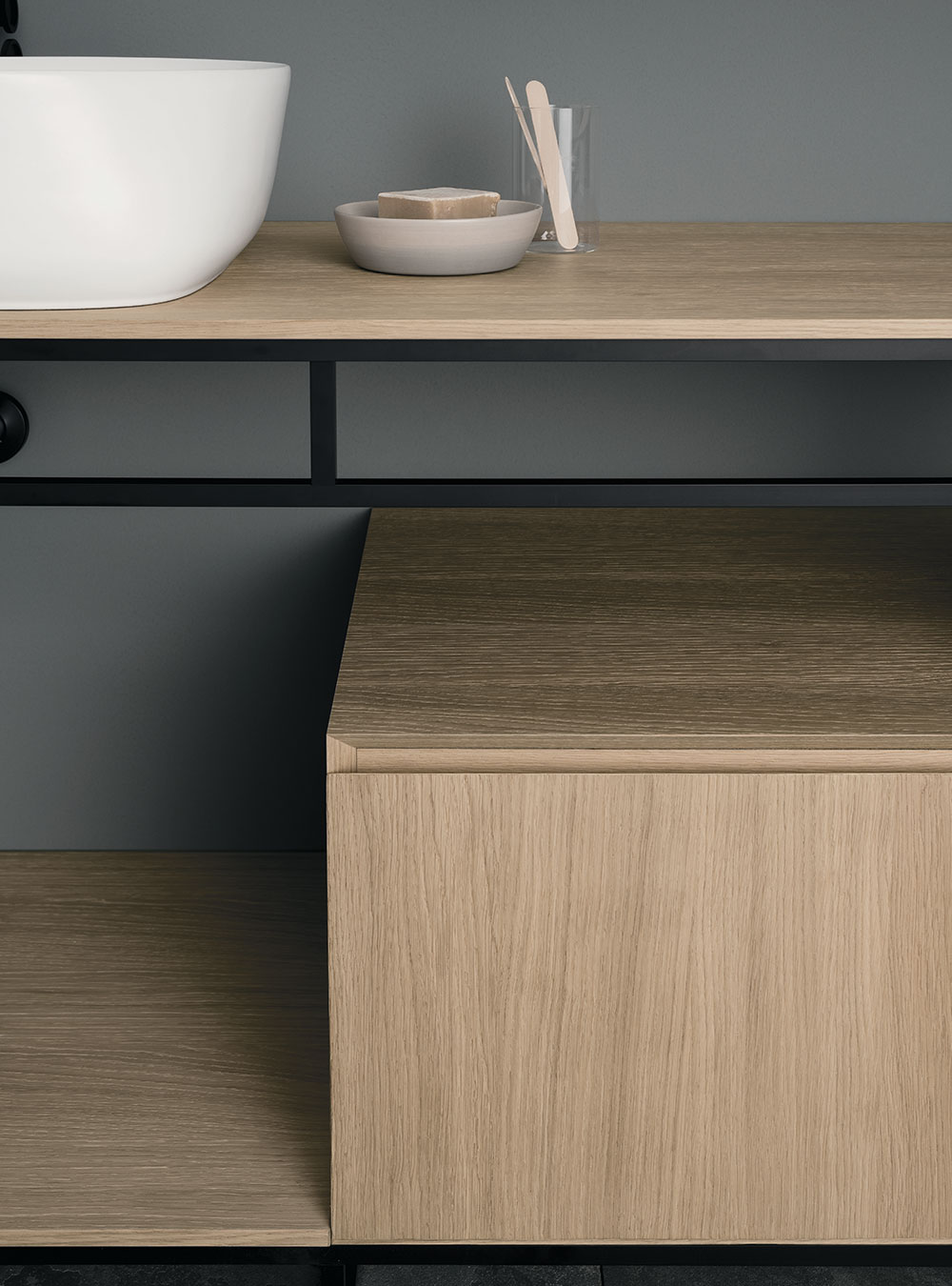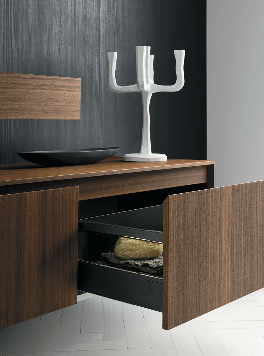 Code is totally in step with the latest trends in bathroom furniture and is geared towards creating spaces with a strong focus on design and wellbeing. A wide range of finishes, wall units and consoles of all types is available, together with a huge choice of complementary items. These ensure the products offered are highly customisable, giving rise to bespoke solutions to accommodate any interior design requirement. With integrated handle grip and the characteristic 45° cut on the sides and front, Code excels for its wide range of modular units and the sophistication of its materials, which mean that pairings of different finishes such as oak or eucalyptus wood and matt or velvet lacquers can be created.