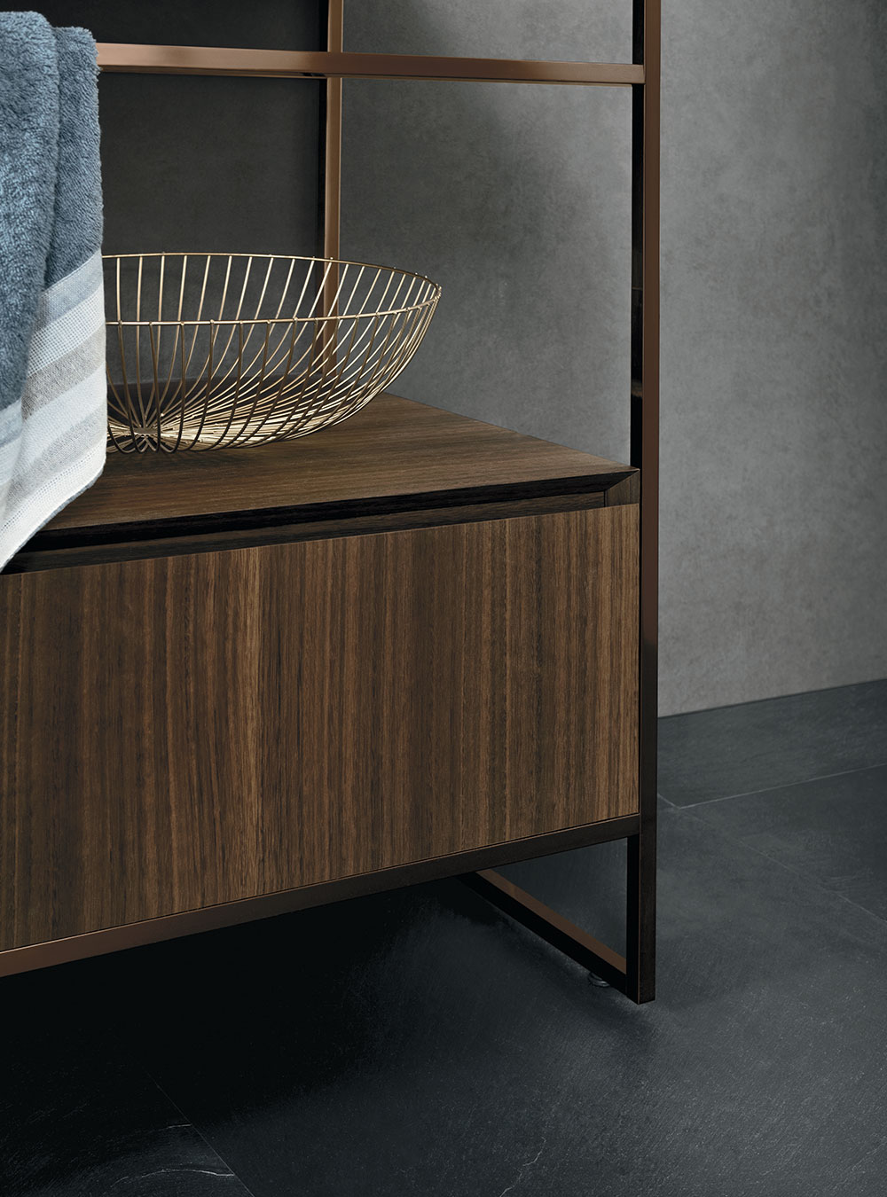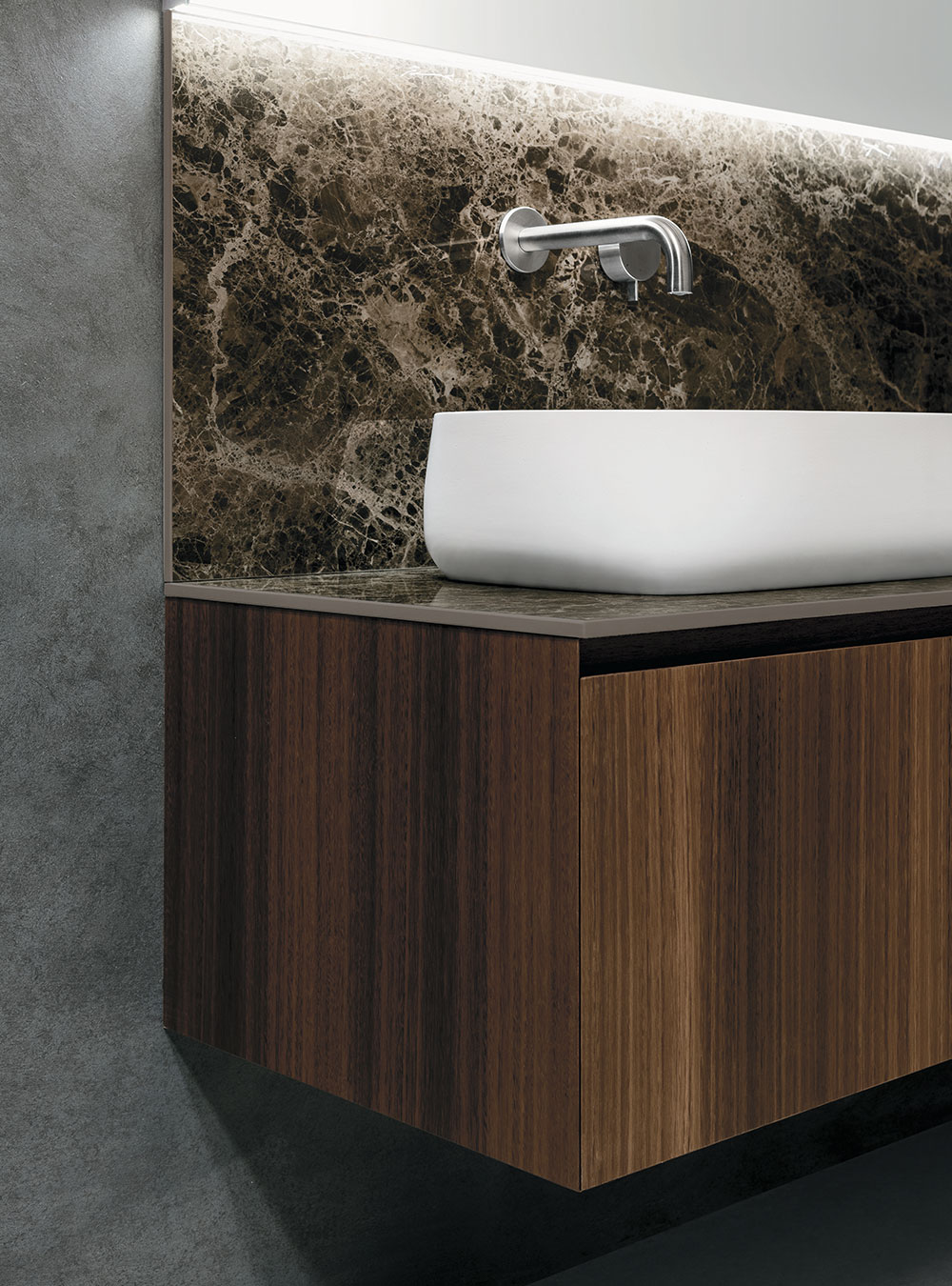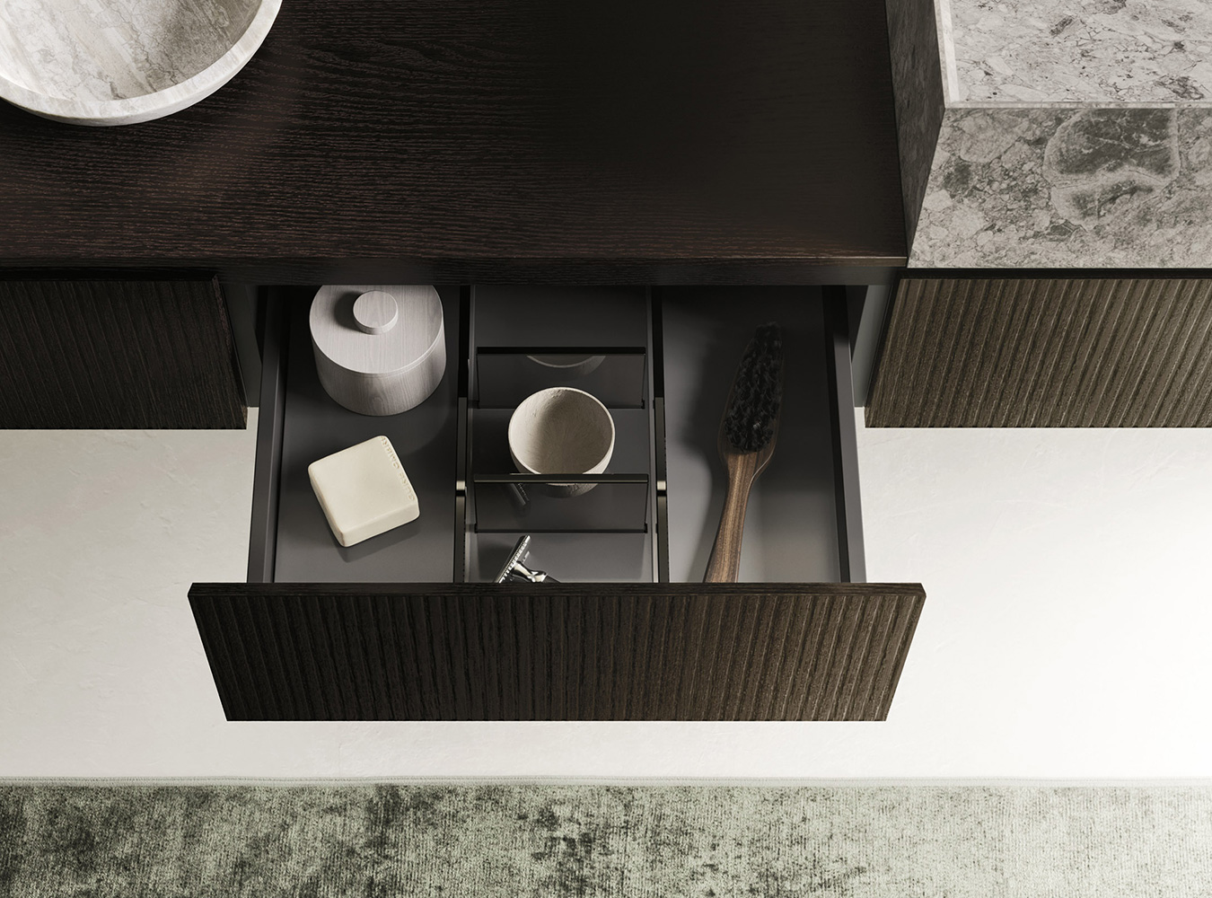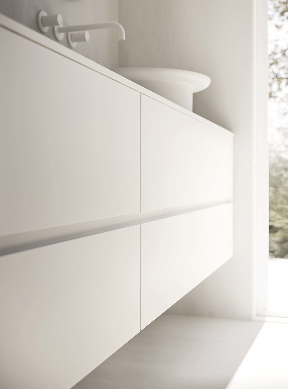 Code is totally in step with the latest trends in bathroom furniture and is geared towards creating spaces with a strong focus on design and wellbeing. A wide range of finishes, wall units and consoles of all types is available, together with a huge choice of complementary items. These ensure the products offered are highly customisable, giving rise to bespoke solutions to accommodate any interior design requirement. With integrated handle grip and the characteristic 45° cut on the sides and front, Code excels for its wide range of modular units and the sophistication of its materials, which mean that pairings of different finishes such as oak or eucalyptus wood and matt or velvet lacquers can be created.