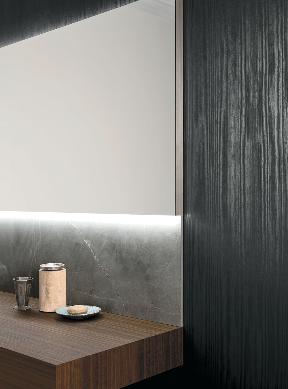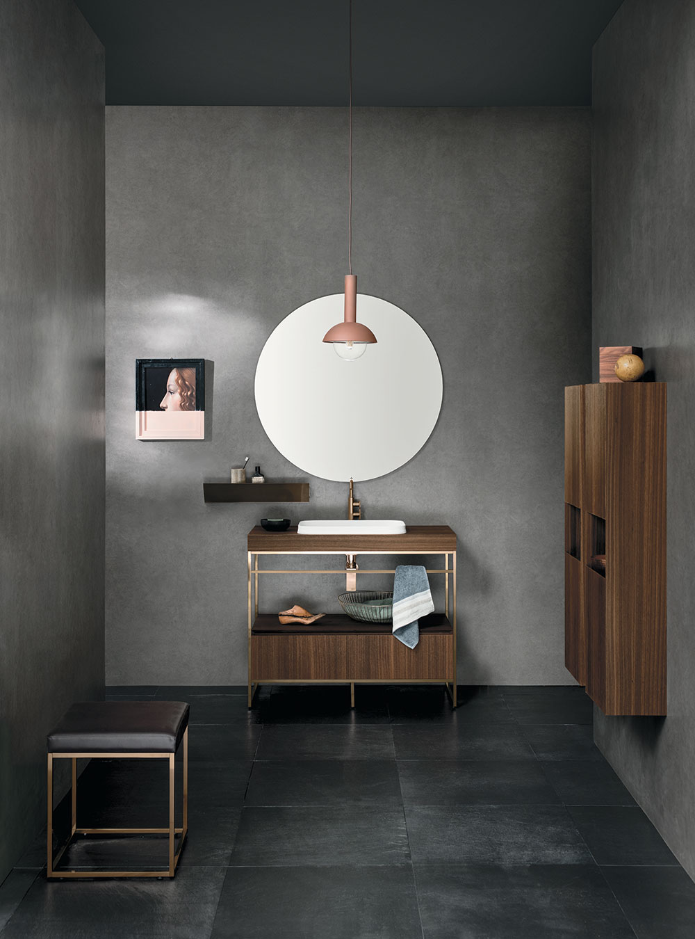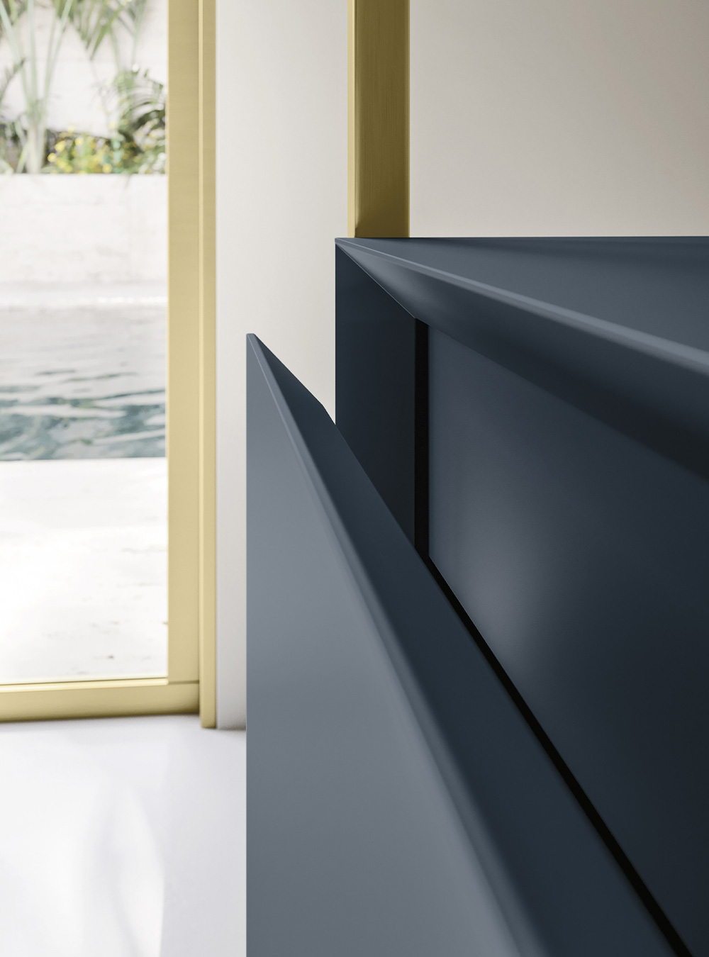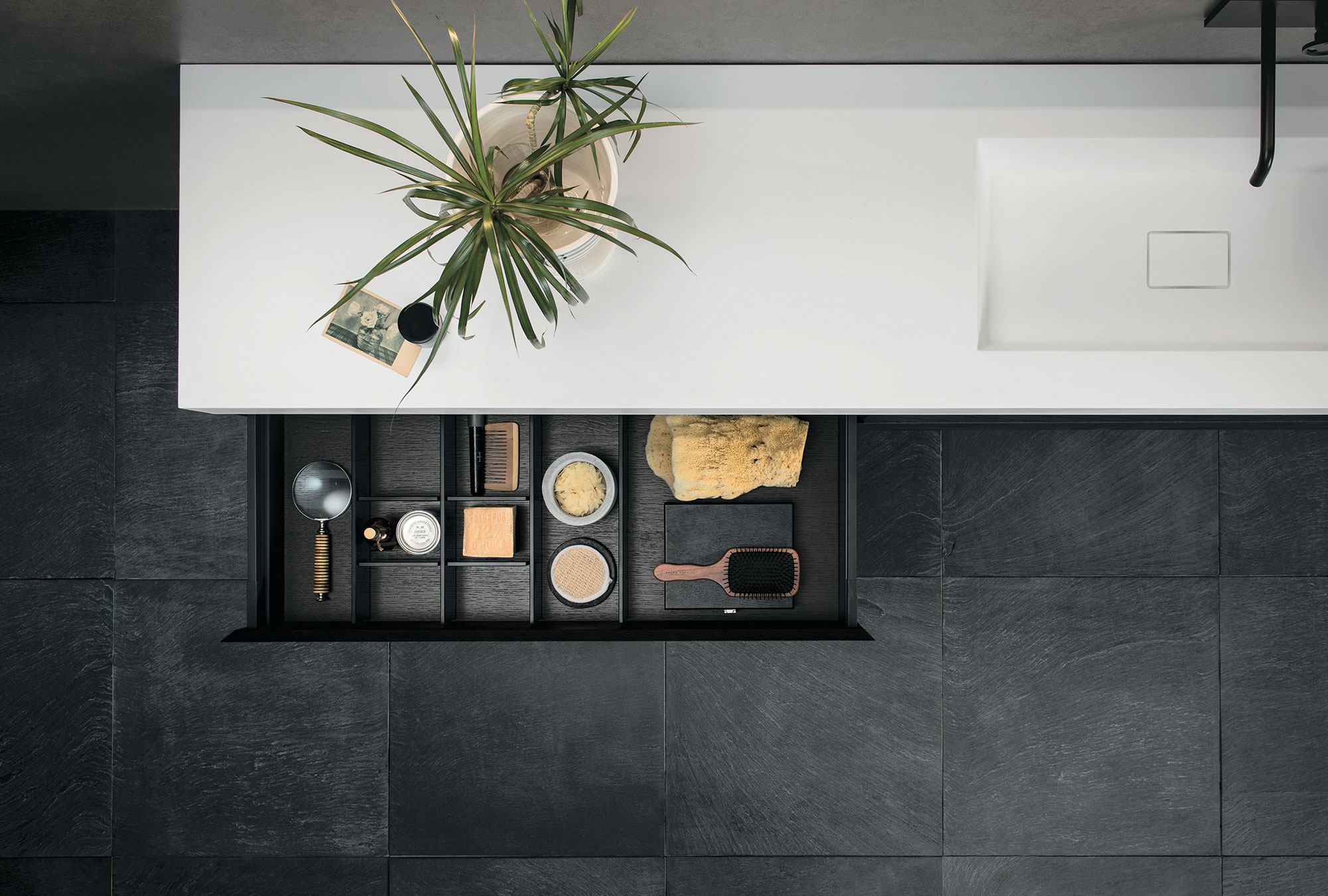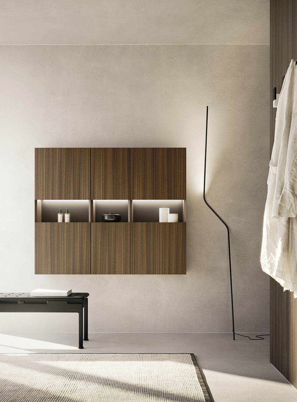 Code is totally in step with the latest trends in bathroom furniture and is geared towards creating spaces with a strong focus on design and wellbeing. A wide range of finishes, wall units and consoles of all types is available, together with a huge choice of complementary items. These ensure the products offered are highly customisable, giving rise to bespoke solutions to accommodate any interior design requirement. With integrated handle grip and the characteristic 45° cut on the sides and front, Code excels for its wide range of modular units and the sophistication of its materials, which mean that pairings of different finishes such as oak or eucalyptus wood and matt or velvet lacquers can be created.