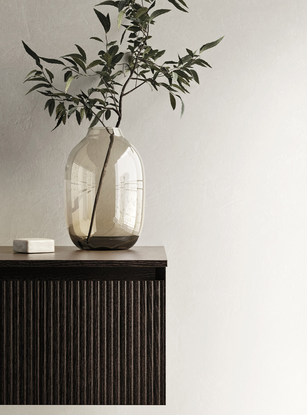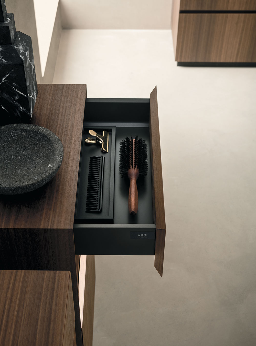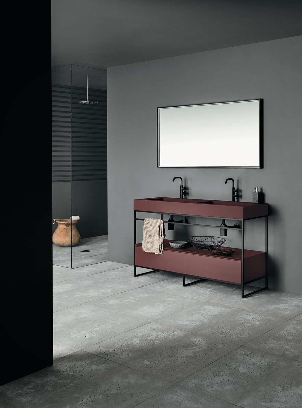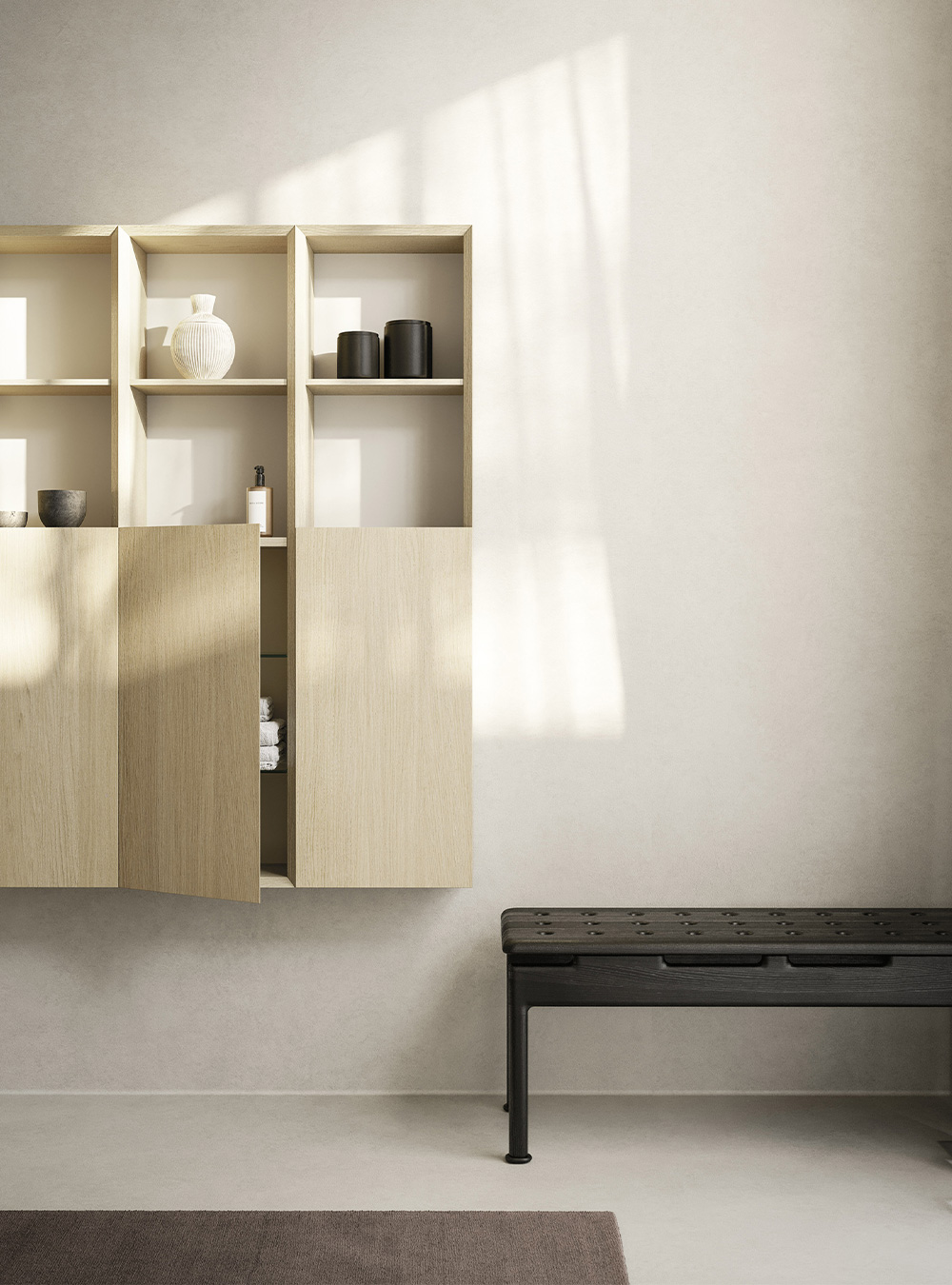 Code is totally in step with the latest trends in bathroom furniture and is geared towards creating spaces with a strong focus on design and wellbeing. A wide range of finishes, wall units and consoles of all types is available, together with a huge choice of complementary items. These ensure the products offered are highly customisable, giving rise to bespoke solutions to accommodate any interior design requirement. With integrated handle grip and the characteristic 45° cut on the sides and front, Code excels for its wide range of modular units and the sophistication of its materials, which mean that pairings of different finishes such as oak or eucalyptus wood and matt or velvet lacquers can be created.