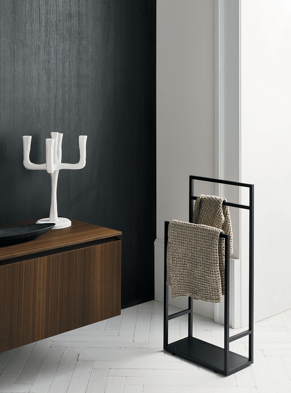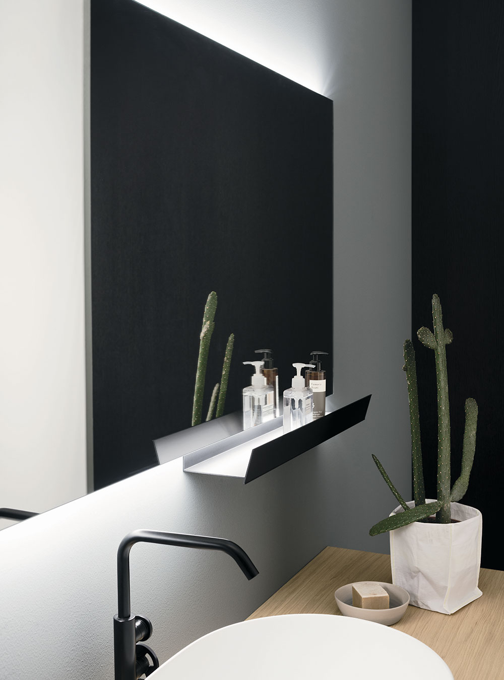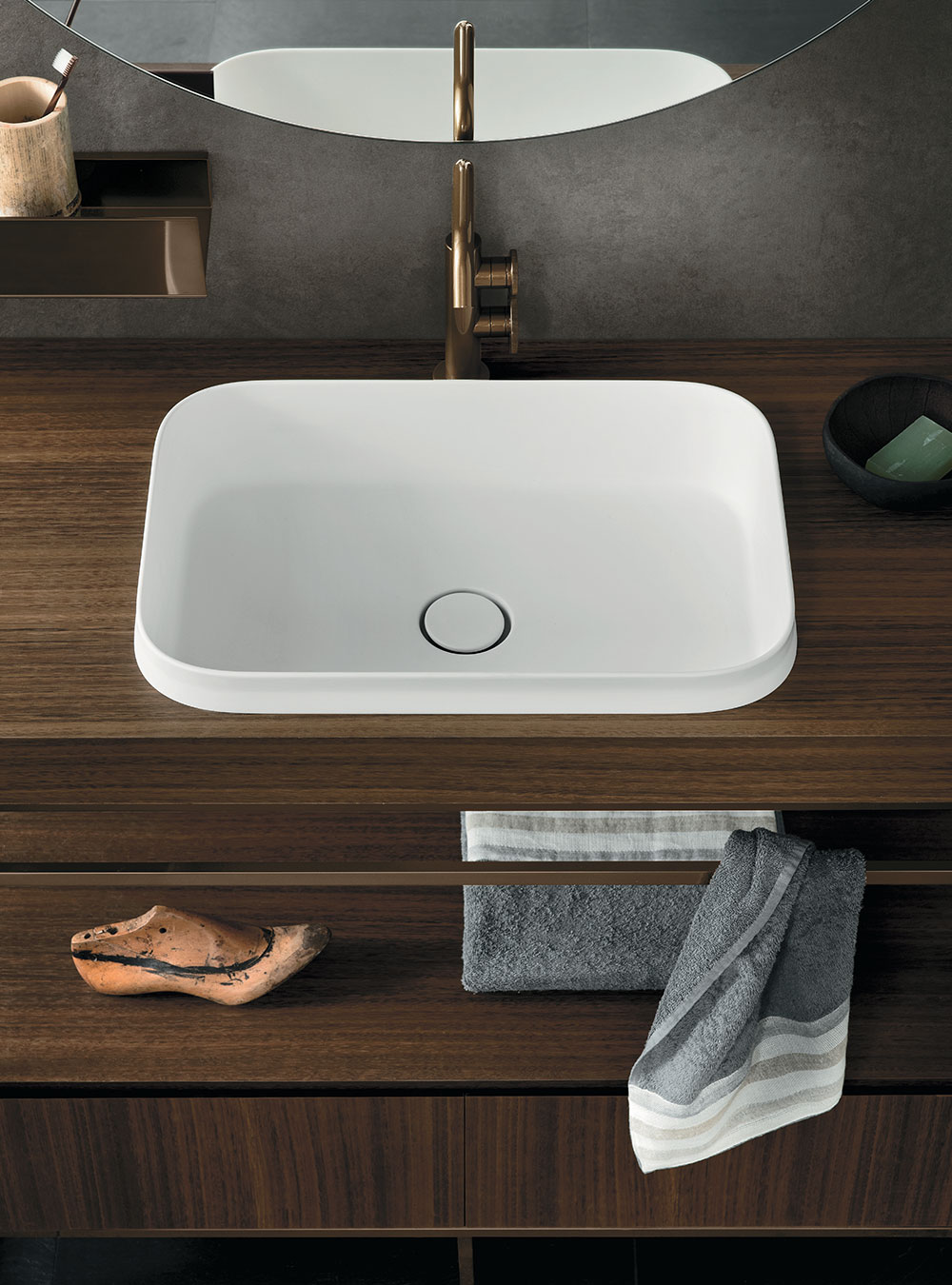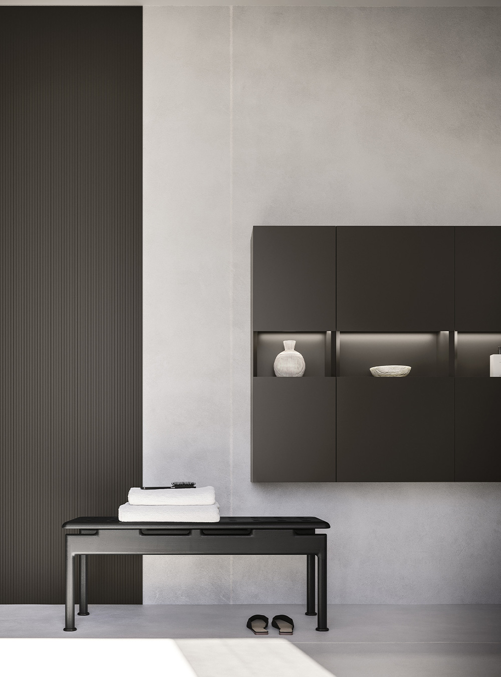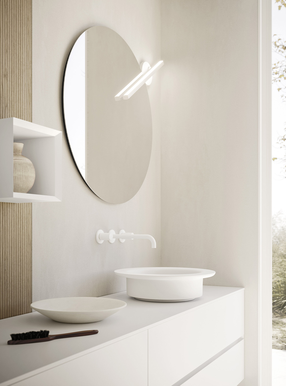 Code is totally in step with the latest trends in bathroom furniture and is geared towards creating spaces with a strong focus on design and wellbeing. A wide range of finishes, wall units and consoles of all types is available, together with a huge choice of complementary items. These ensure the products offered are highly customisable, giving rise to bespoke solutions to accommodate any interior design requirement. With integrated handle grip and the characteristic 45° cut on the sides and front, Code excels for its wide range of modular units and the sophistication of its materials, which mean that pairings of different finishes such as oak or eucalyptus wood and matt or velvet lacquers can be created.