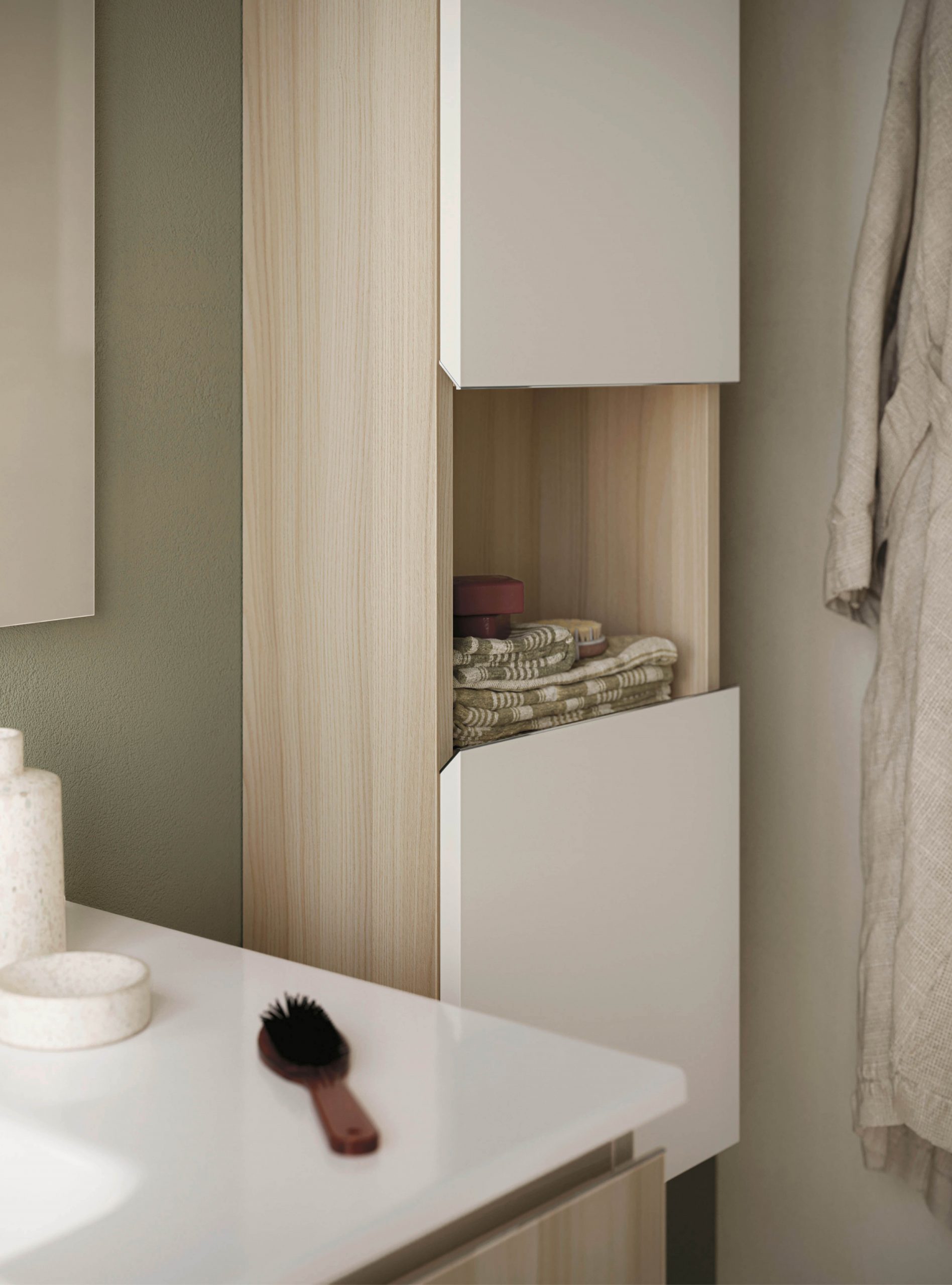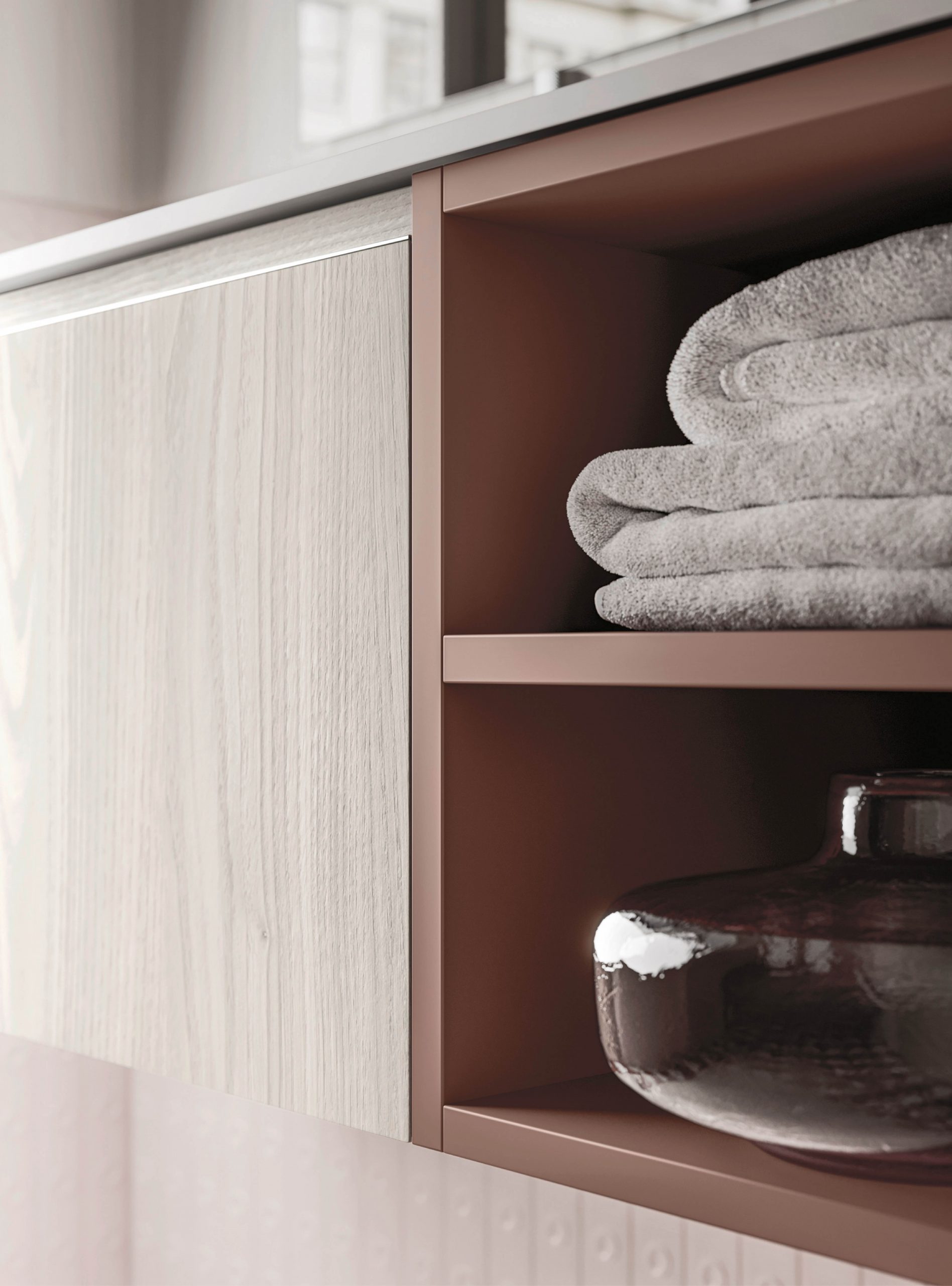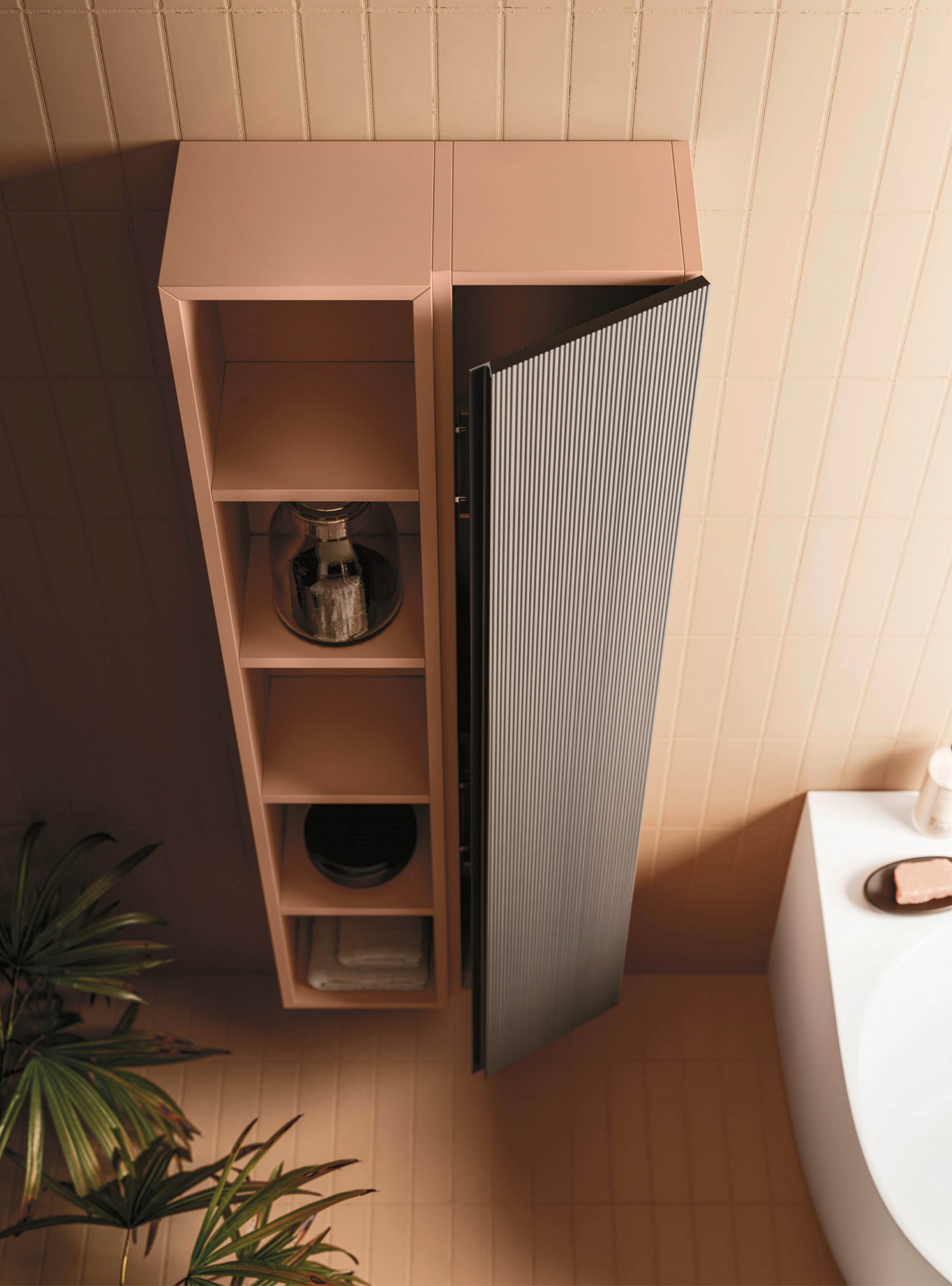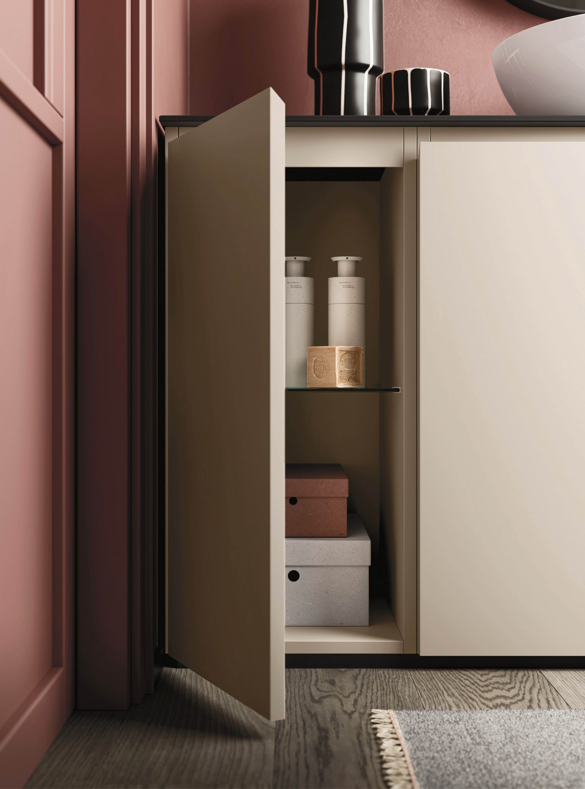 The Ho.Me plus family is enriched with a new version. Ho.Me plus 45° is characterized by a door with a 45° cut, which becomes the comfortable integrated grip. The possible finishes range from melamine to coloured melamine and matt lacquer finishes to suit every style and personality.