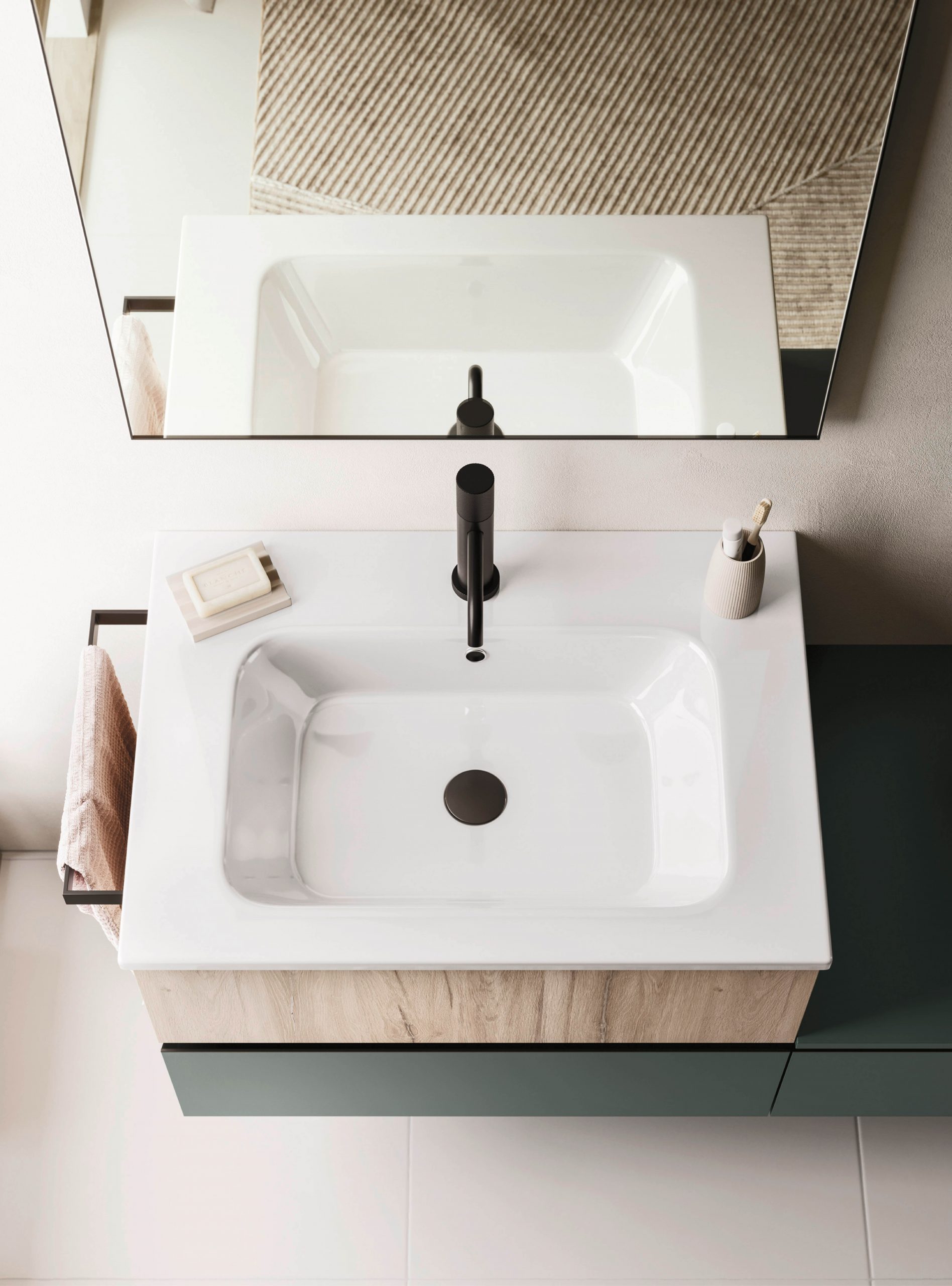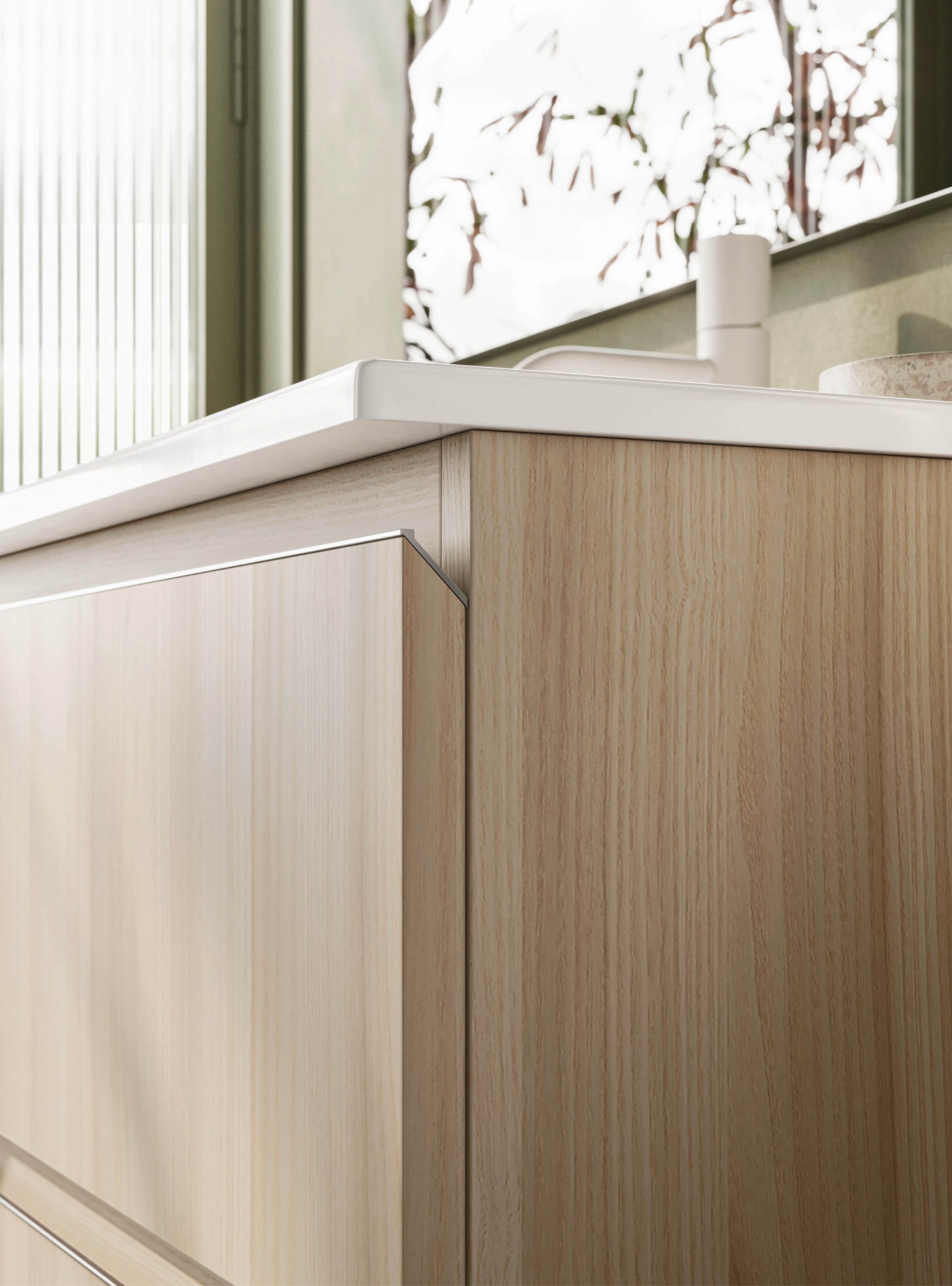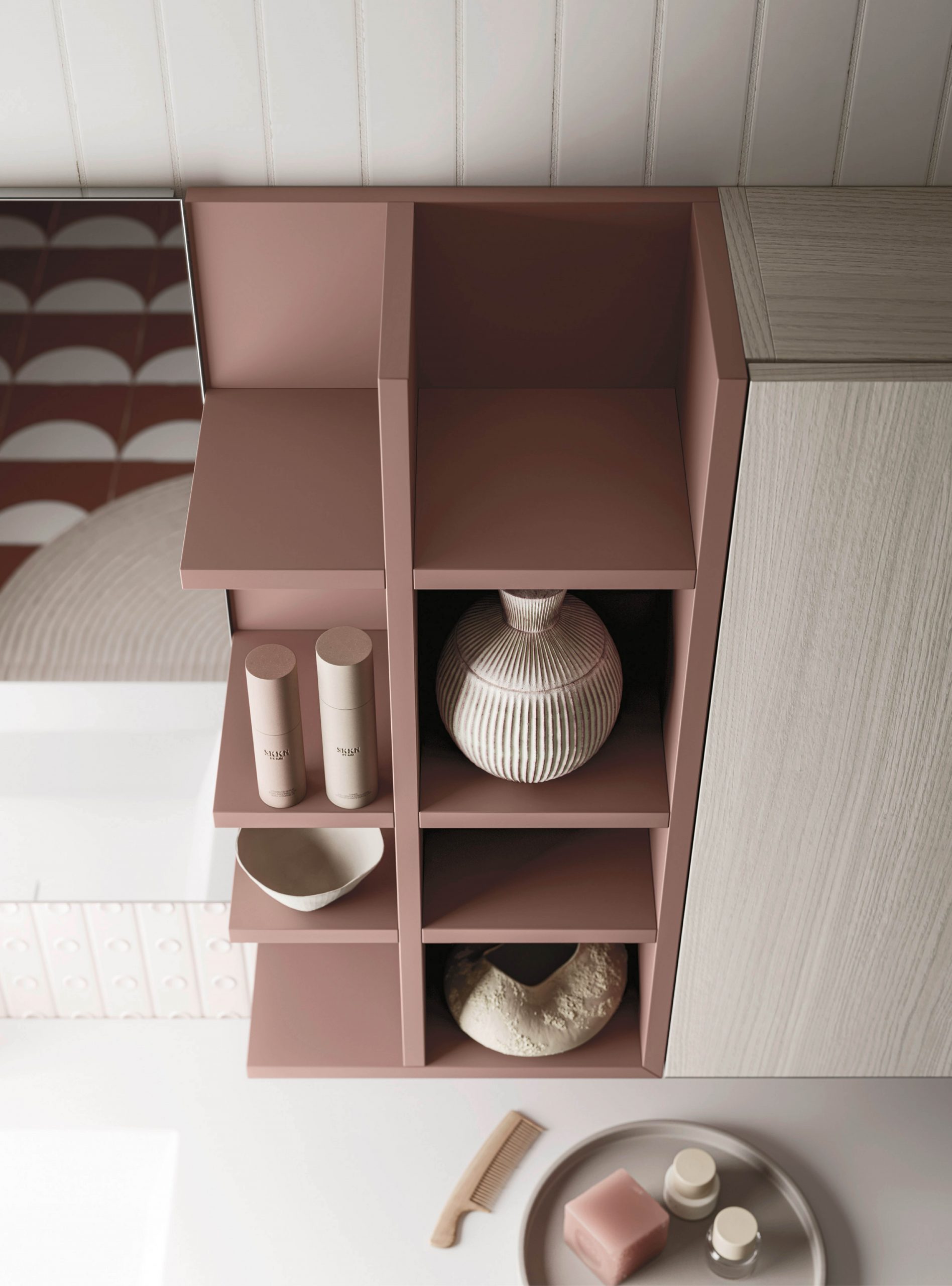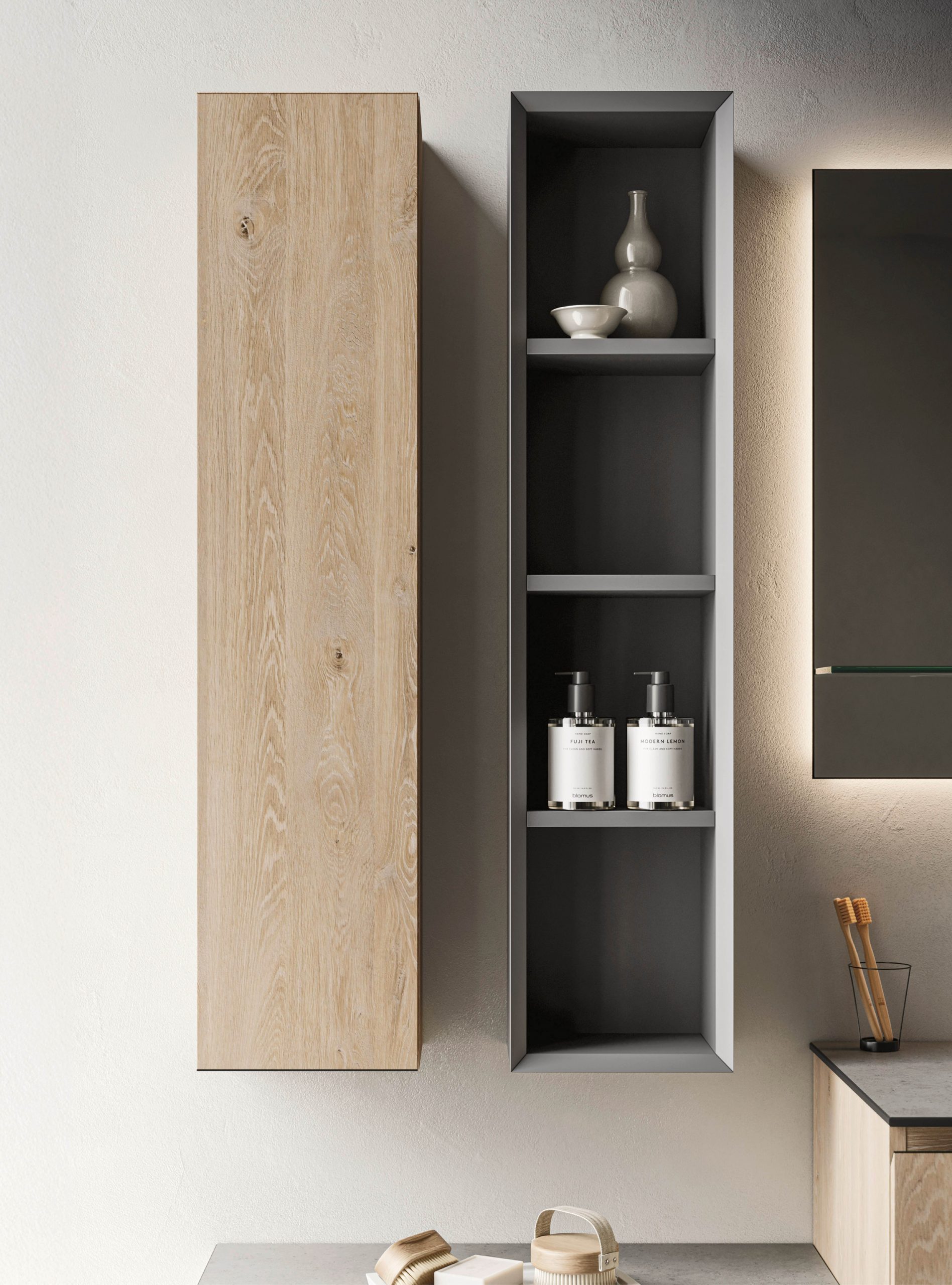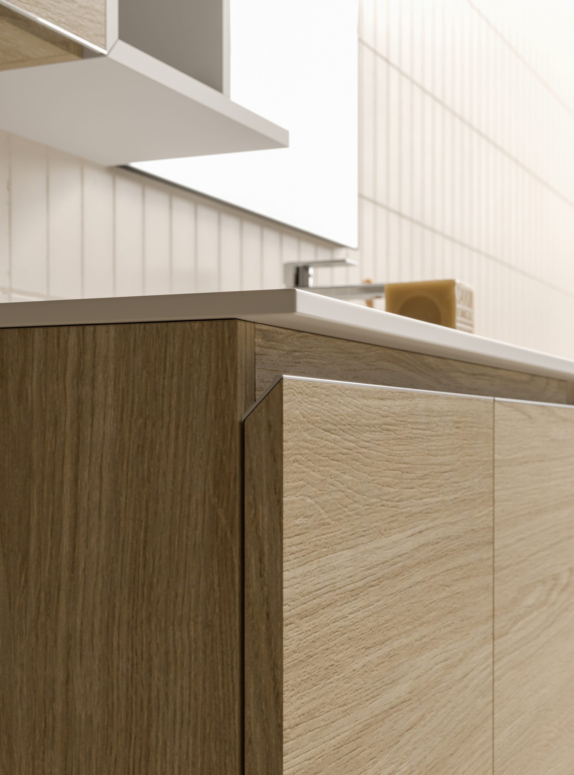 The Ho.Me plus family is enriched with a new version. Ho.Me plus 45° is characterized by a door with a 45° cut, which becomes the comfortable integrated grip. The possible finishes range from melamine to coloured melamine and matt lacquer finishes to suit every style and personality.