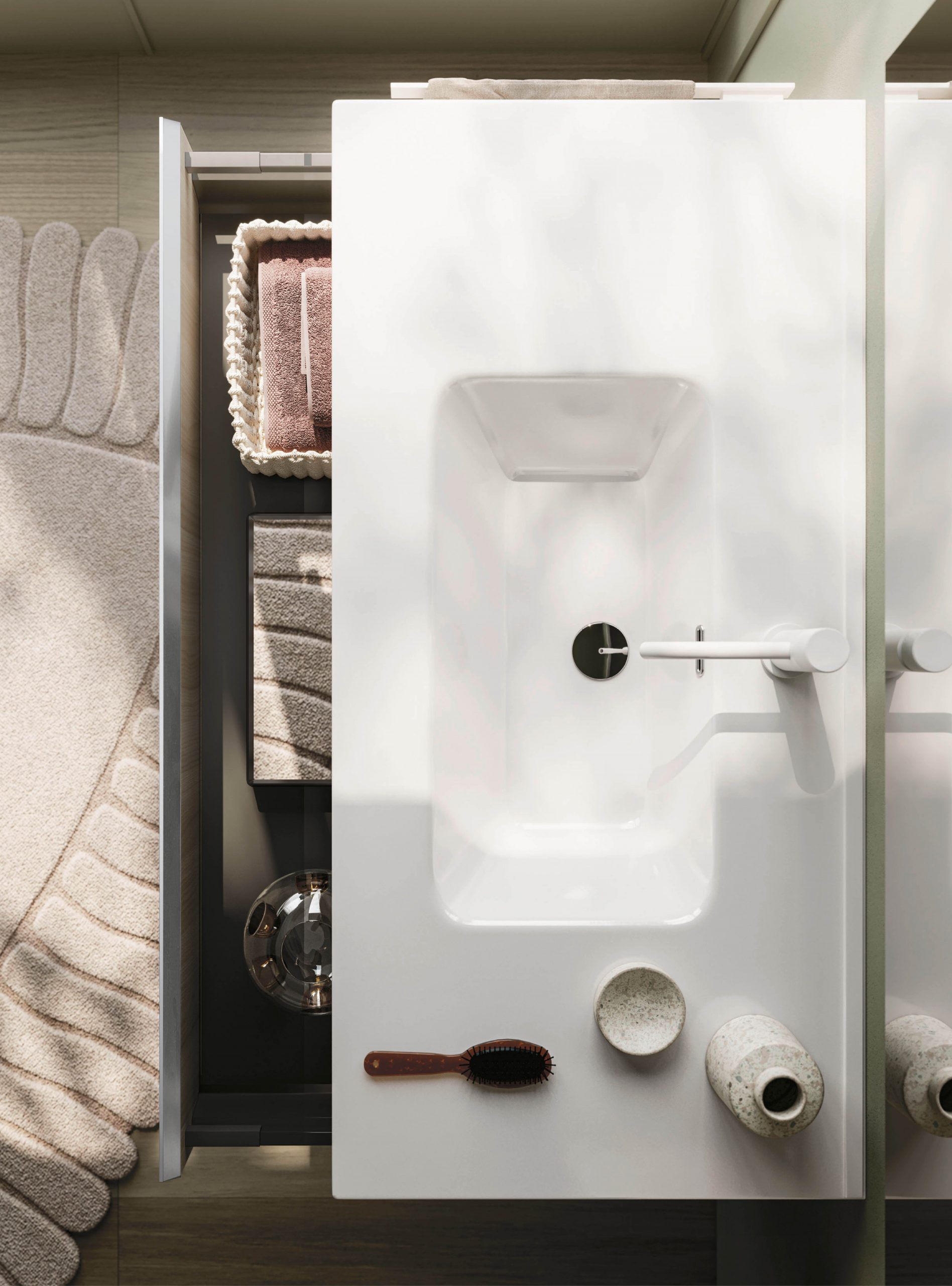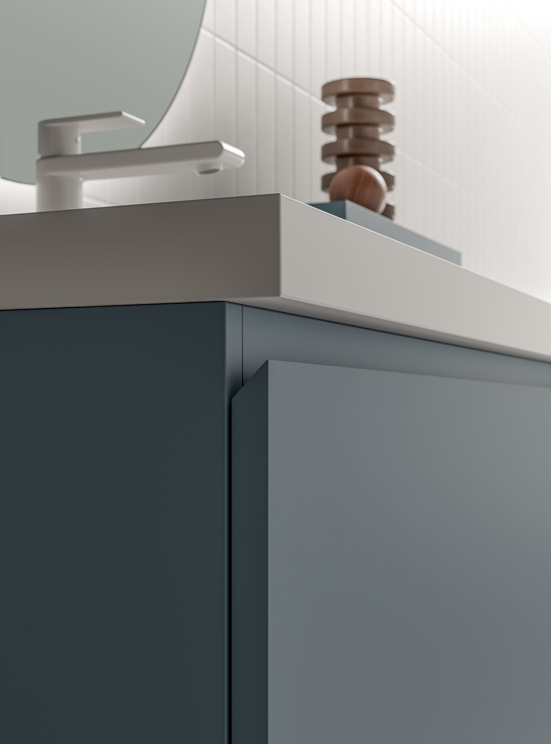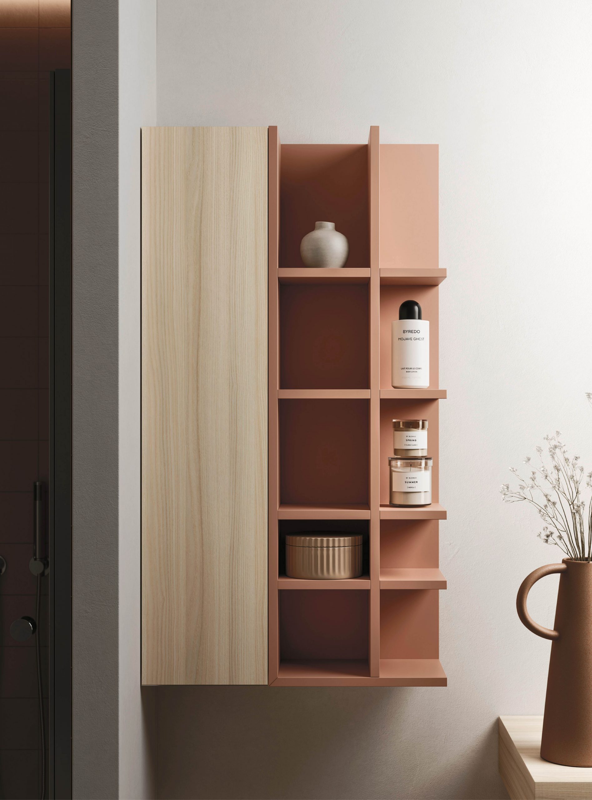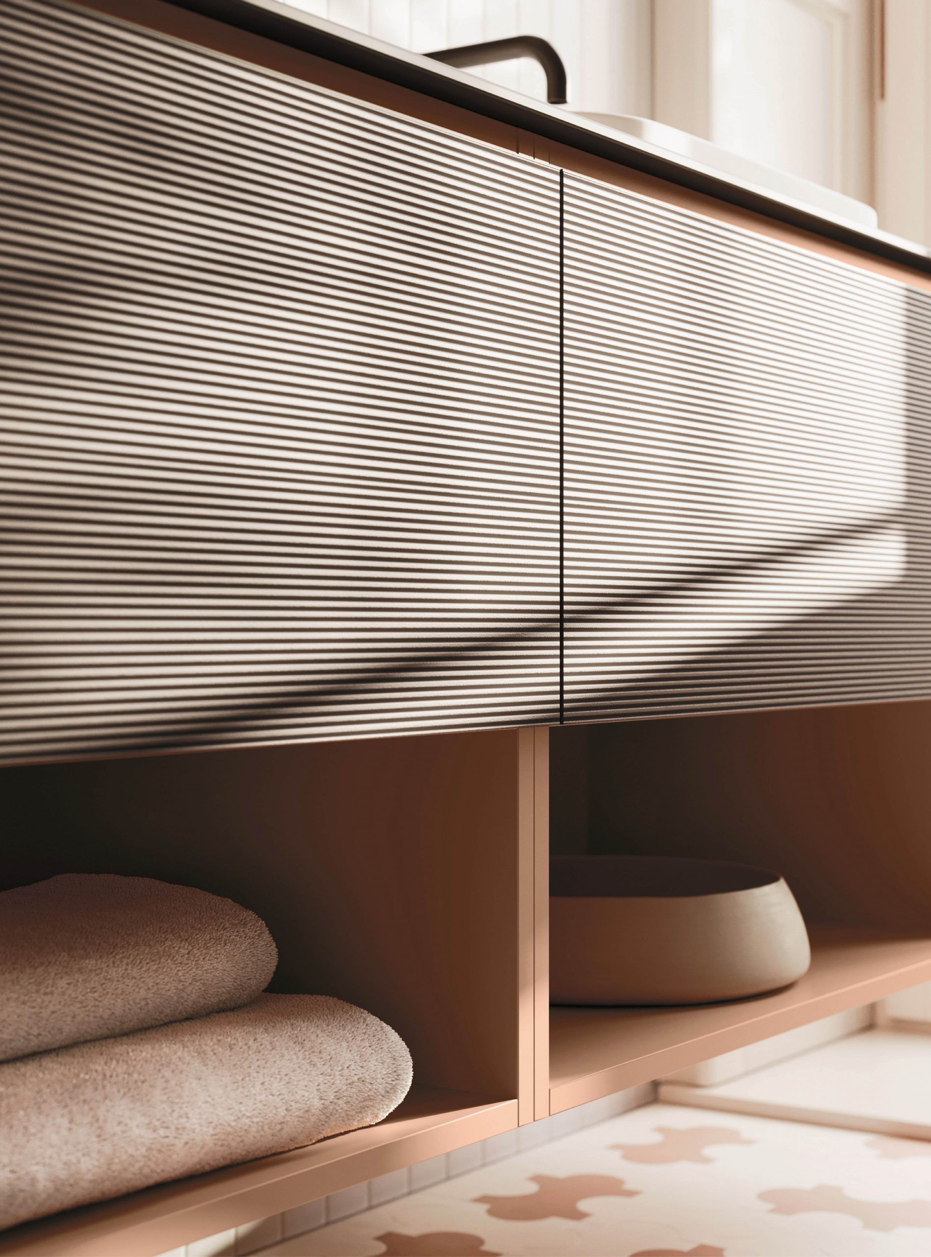 The Ho.Me plus family is enriched with a new version. Ho.Me plus 45° is characterized by a door with a 45° cut, which becomes the comfortable integrated grip. The possible finishes range from melamine to coloured melamine and matt lacquer finishes to suit every style and personality.