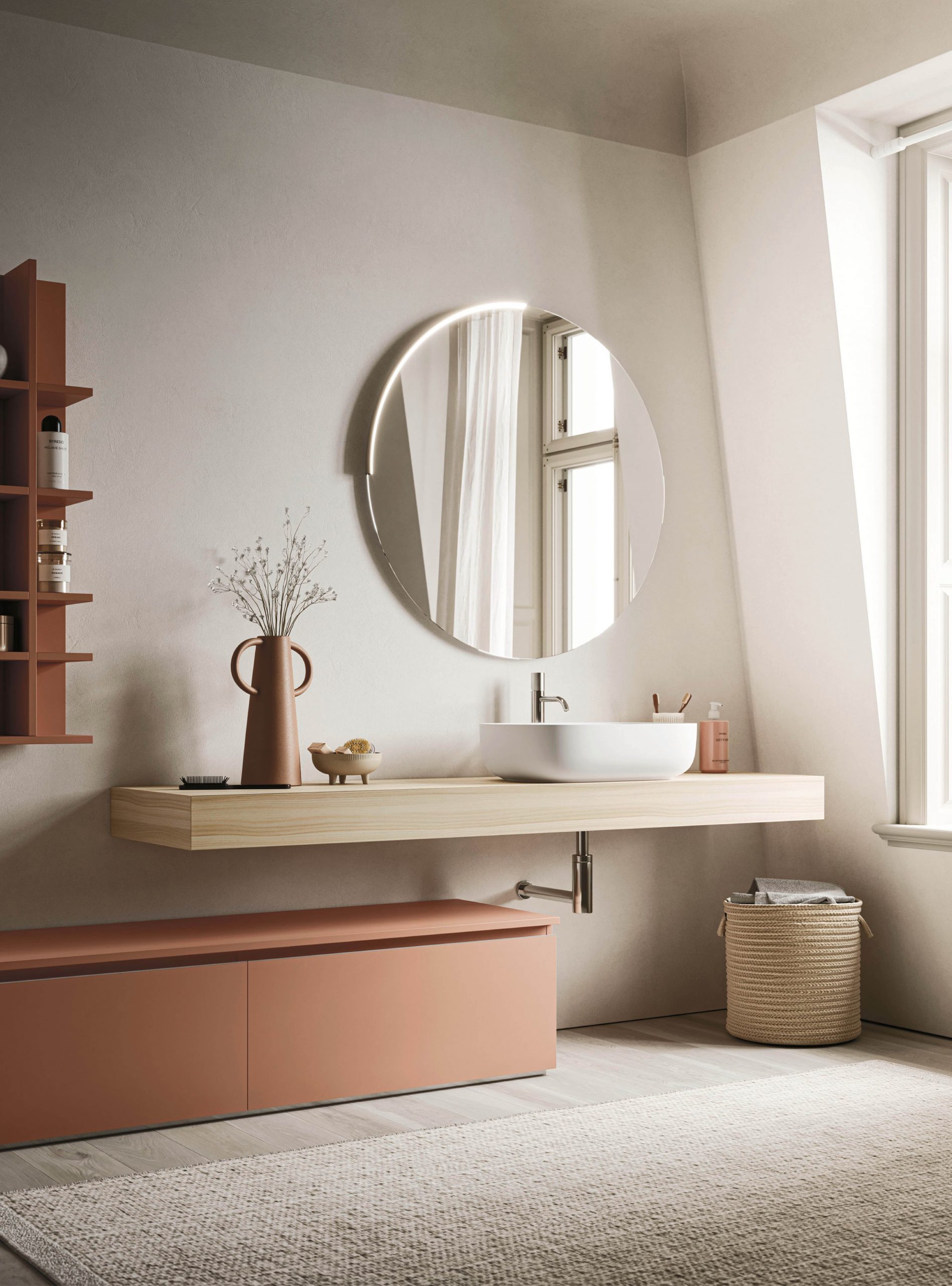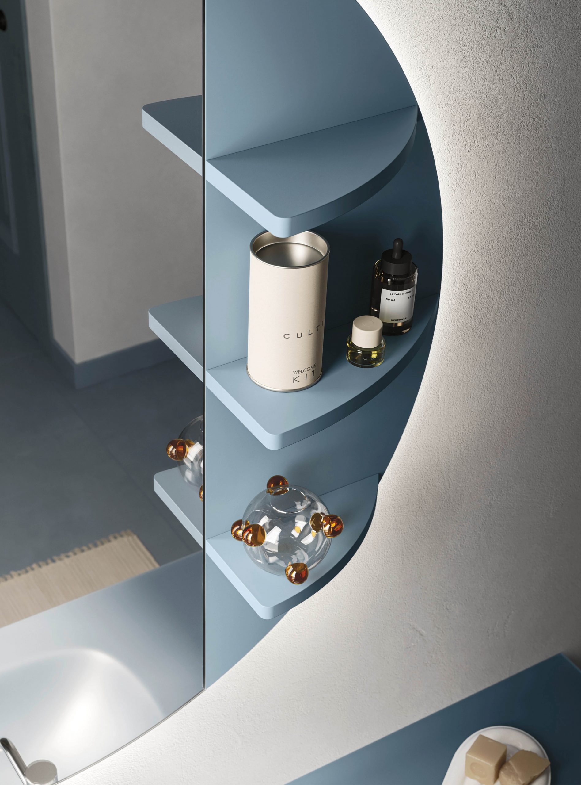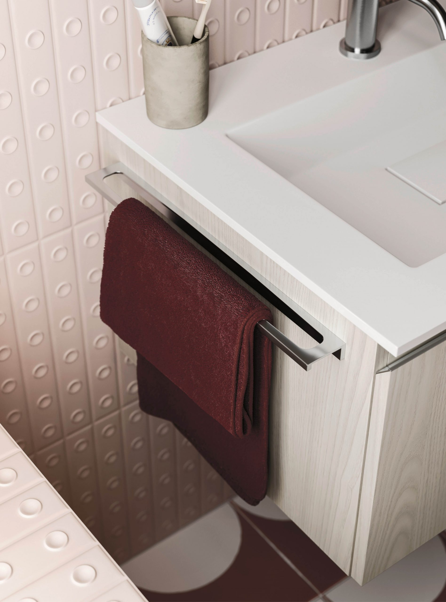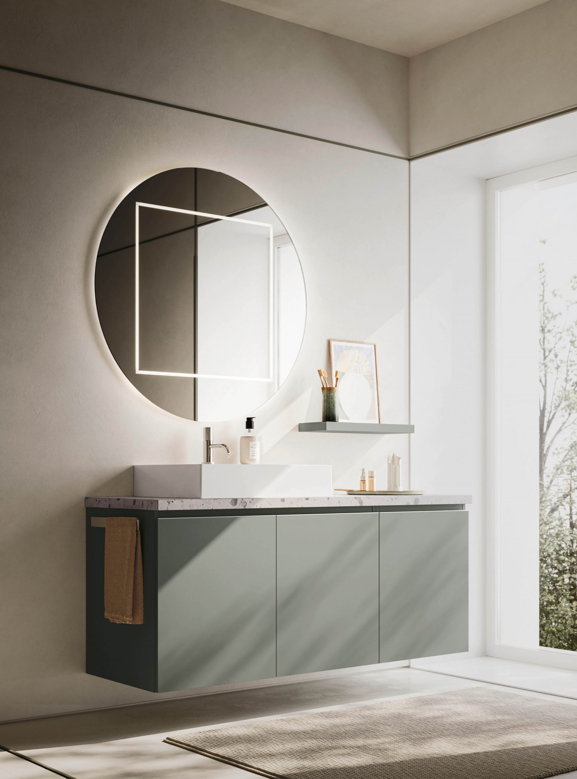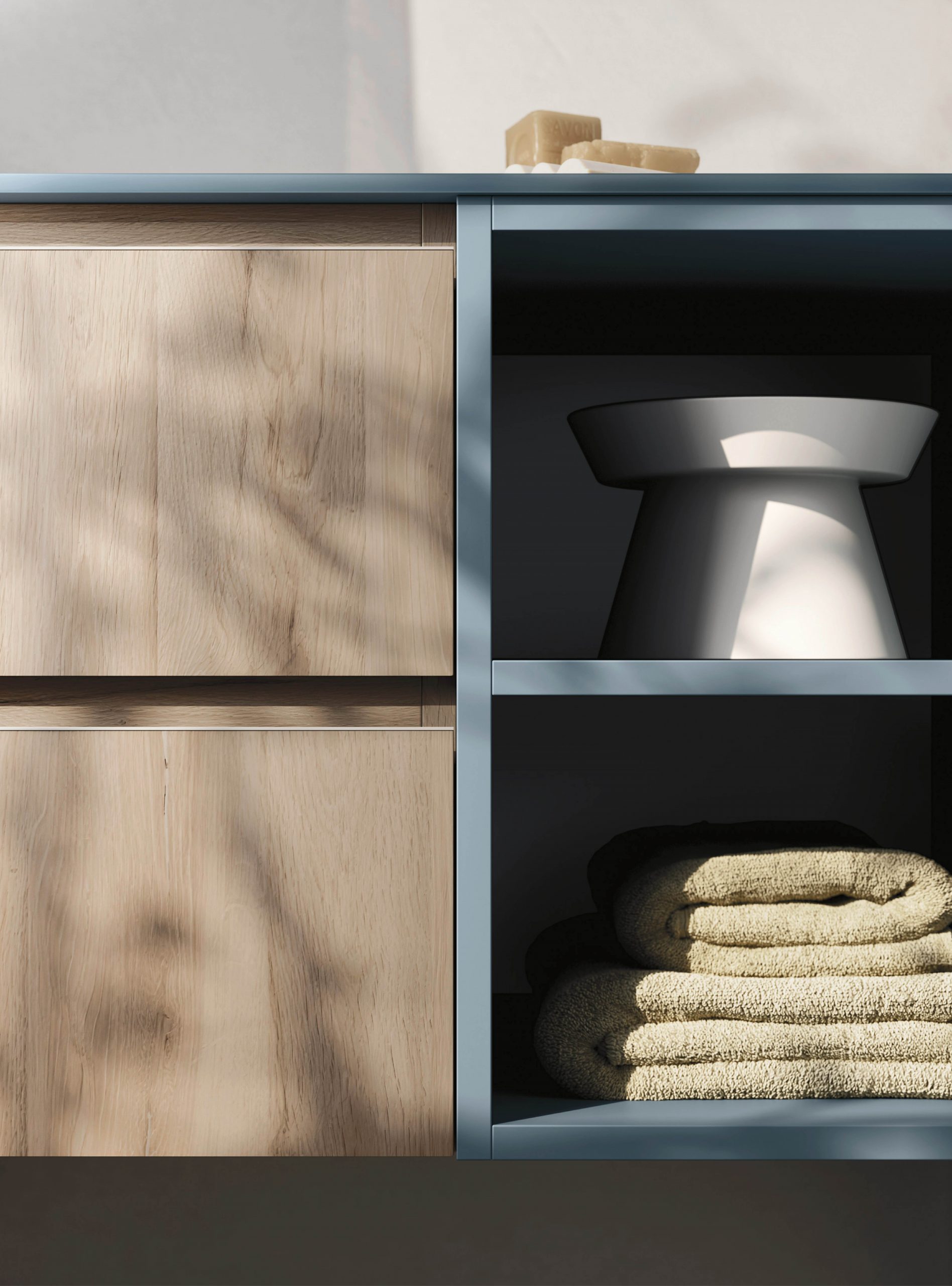 The Ho.Me plus family is enriched with a new version. Ho.Me plus 45° is characterized by a door with a 45° cut, which becomes the comfortable integrated grip. The possible finishes range from melamine to coloured melamine and matt lacquer finishes to suit every style and personality.
