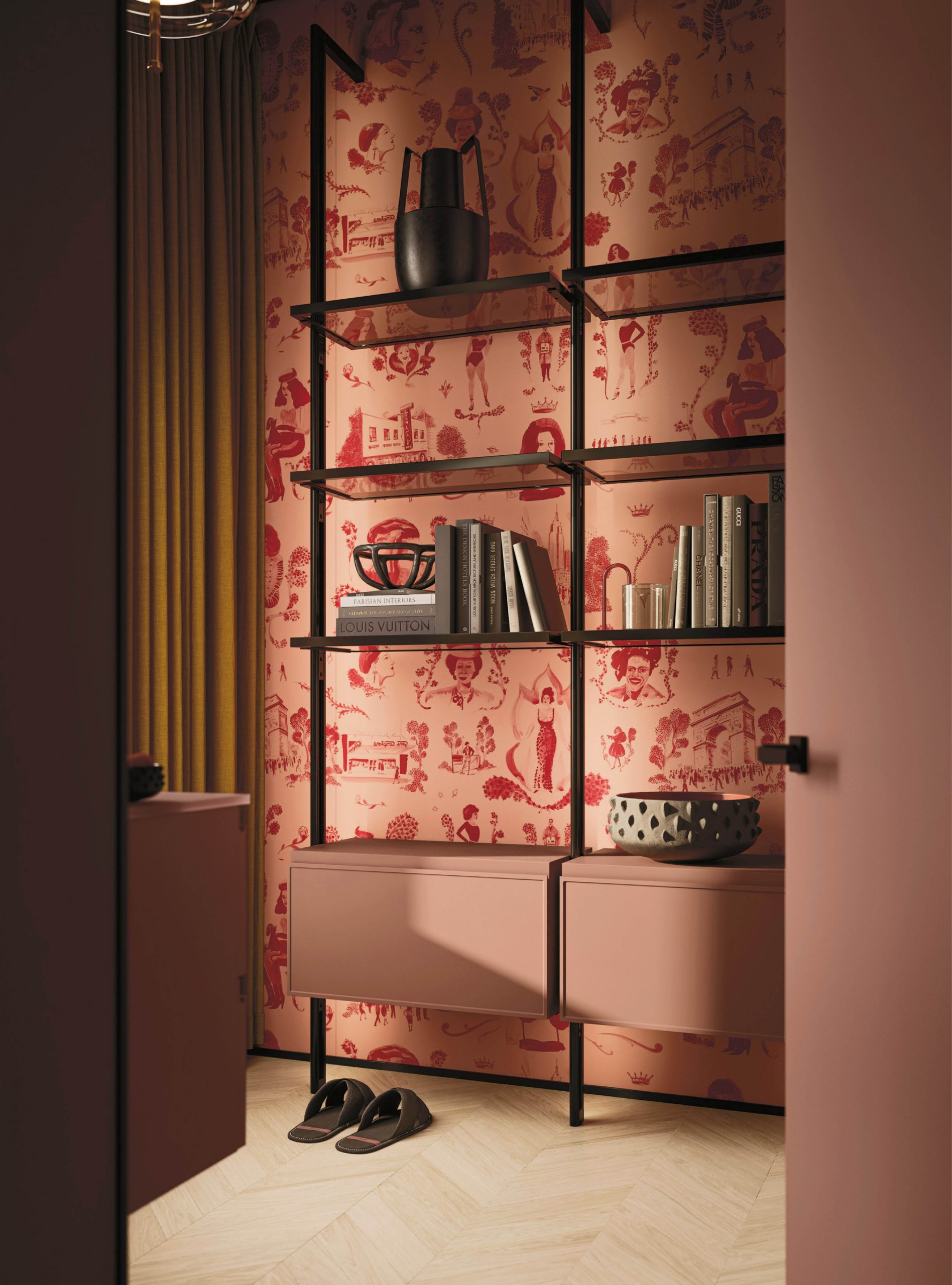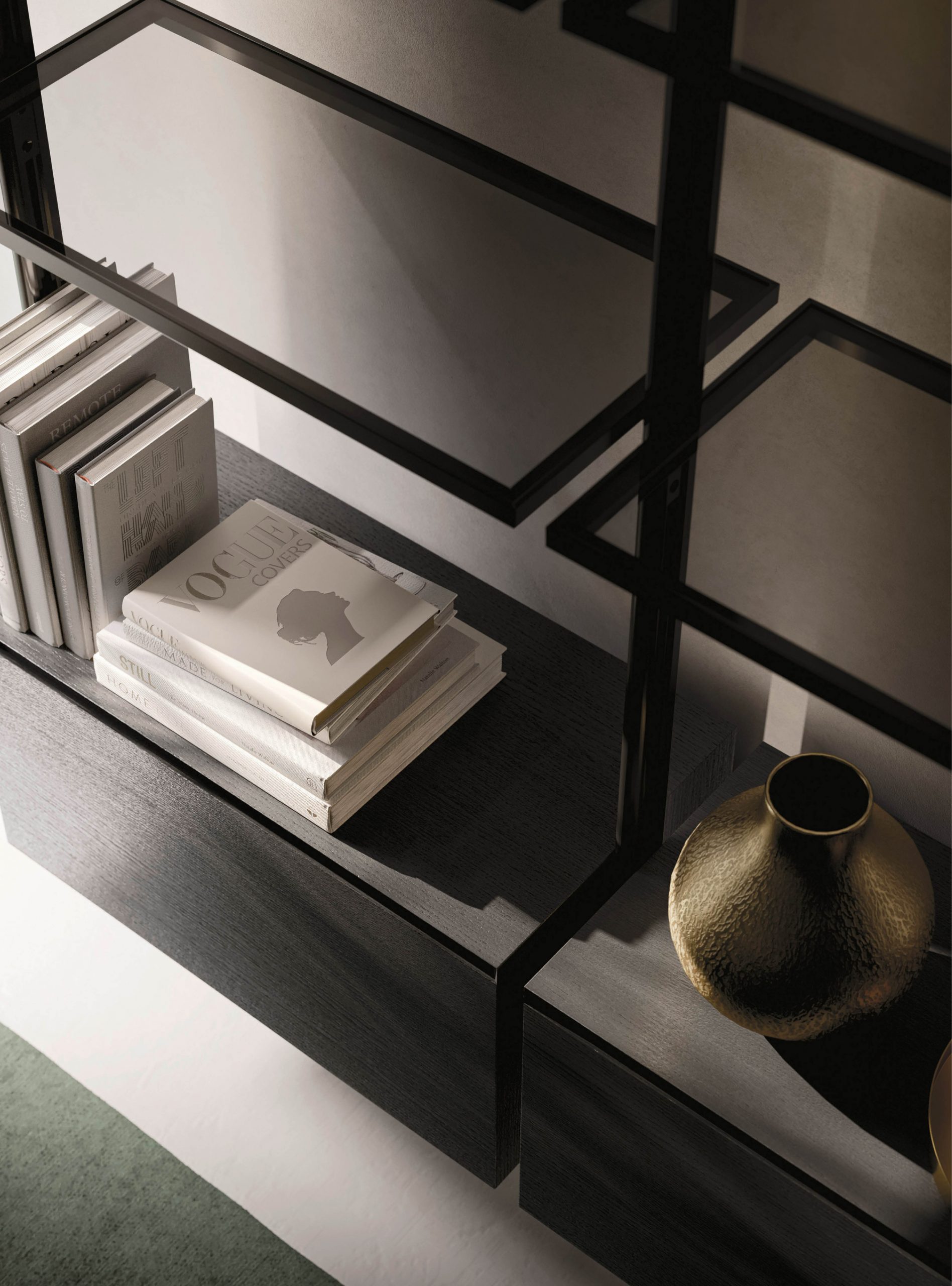 Elements Modular structure with grey glass shelves and black aluminium pillars