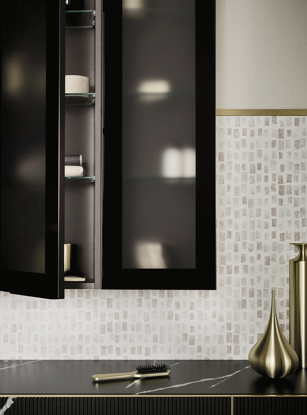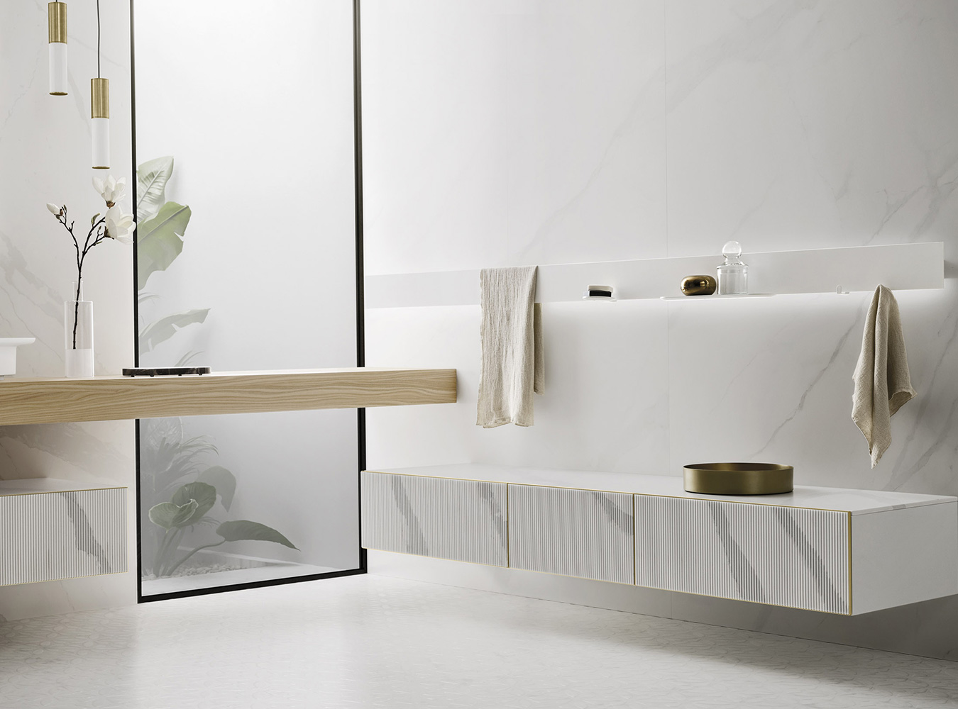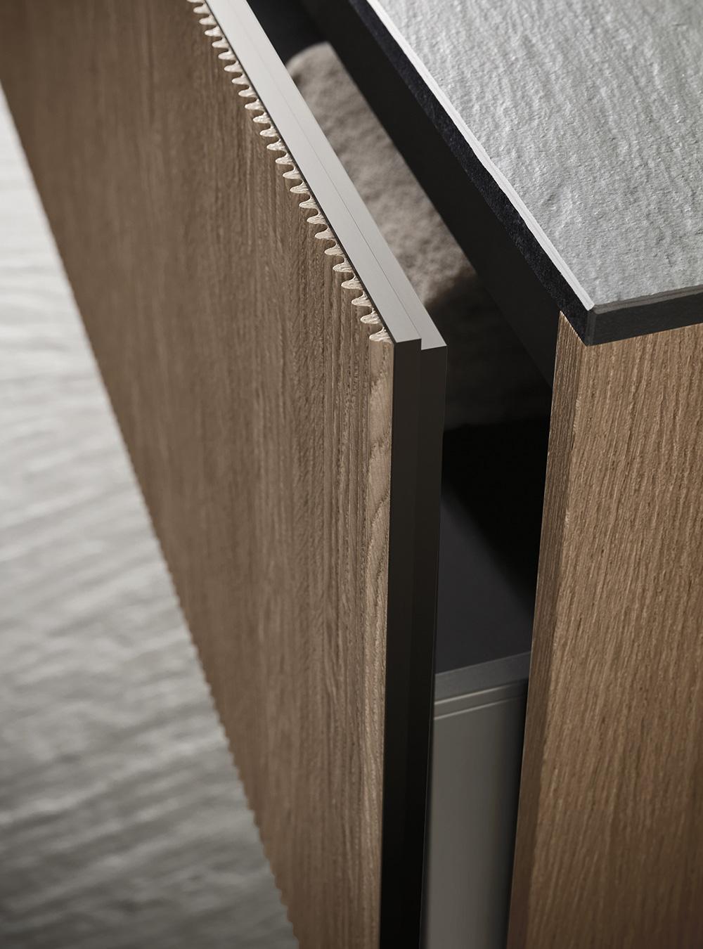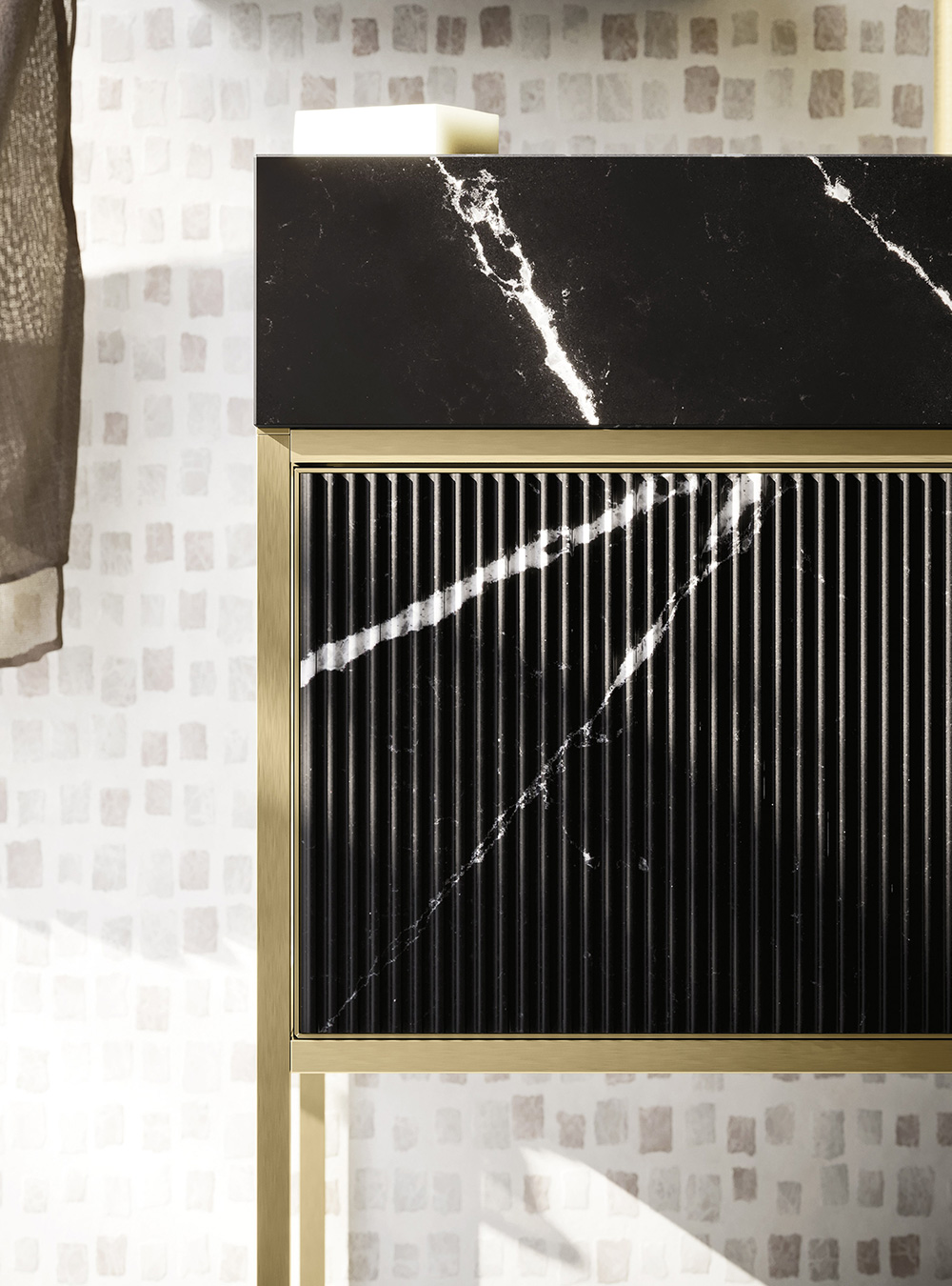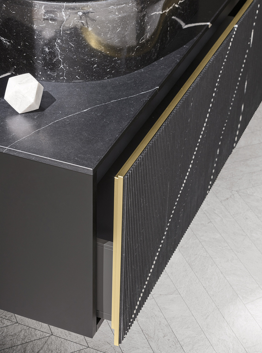 A precious frame in a brushed finish which encircles unusual tactile and visual effects. The warmth of wood, the charm of ceramics and the prestige of marble are exhalted by innovative manufacturing processes. Thanks to luxor, the space is filled with pure beauty, without compromise nor comparisons.